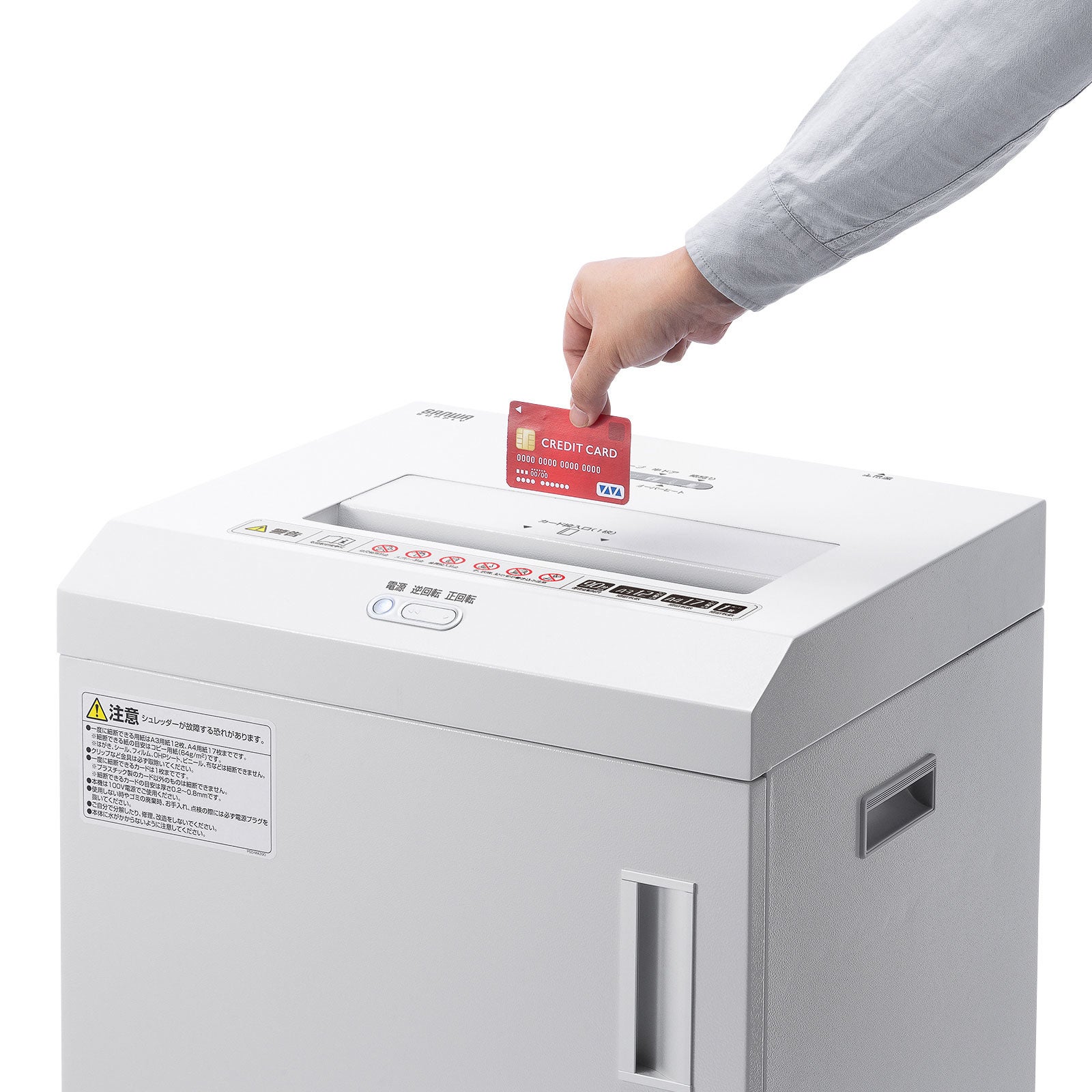 用紙の細断形状は極めて判読しづらい2×8mmマイクロカットです。カードの細断にも対応しており、ゴミ箱からの情報漏洩を防ぎます。ホッチキスの芯が付いたまま細断できるので、手間がかかりません。