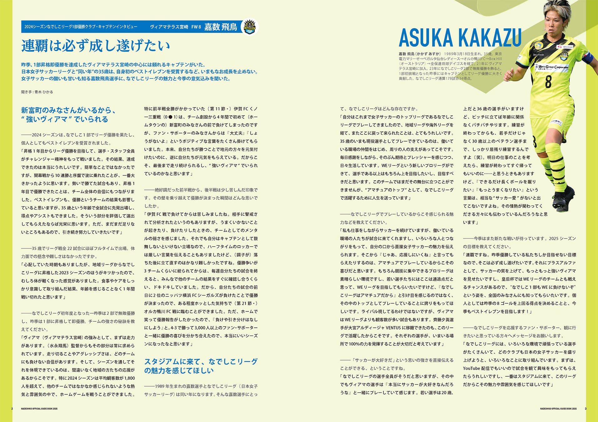 巻頭特集では、昨シーズン1部昇格即優勝を成し遂げたヴィアマテラス宮崎のキャプテン・嘉数飛鳥選手、そして同じく昨シーズンにベストイレブン・得点王・敢闘賞の3冠に輝いた静岡SSUボニータ・土屋佑津季選手のインタビューを敢行。両選手ともに、今シーズンへの意気込みを力強く語っています。