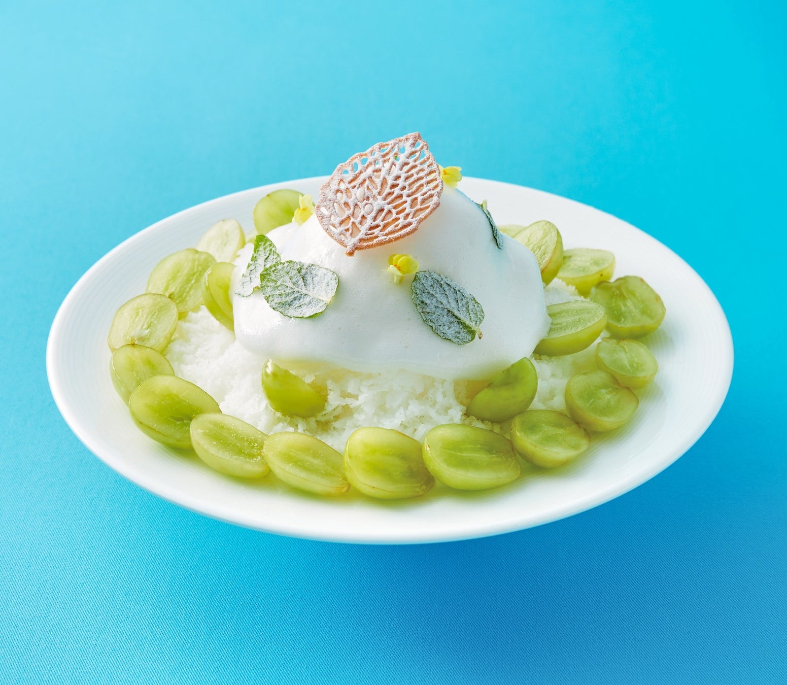 8月後半から最盛期を迎えるシャインマスカットのかき氷が初登場。 爽やかなライムのシャーベットの上にミルク氷を重ね、カルピス®のエスプーマをトッピング。10粒以上のシャインマスカットを並べ、リーフ型のシガールを飾って仕上げました。