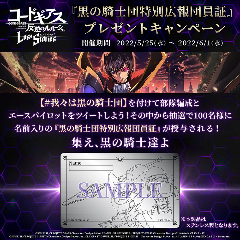 Twitterにて「@geass_game」をフォロー後、【#我々は黒の騎士団】をつけて部隊編成とエースパイロットをツイートしていただいた方の中から、抽選で100名様に、名前入りの「黒の騎士団特別広報団員証」をプレゼント!是非ご投稿ください!