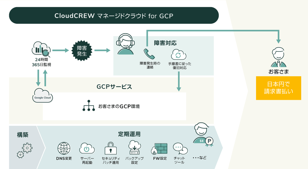 『マネージドクラウド for GCP』では「Google Cloud」の認定資格を持つSEが運用設計を担い、24時間365日、GCP上のクラウド環境の監視や運用・保守業務を「CloudCREW byGMO」が代行いたします。