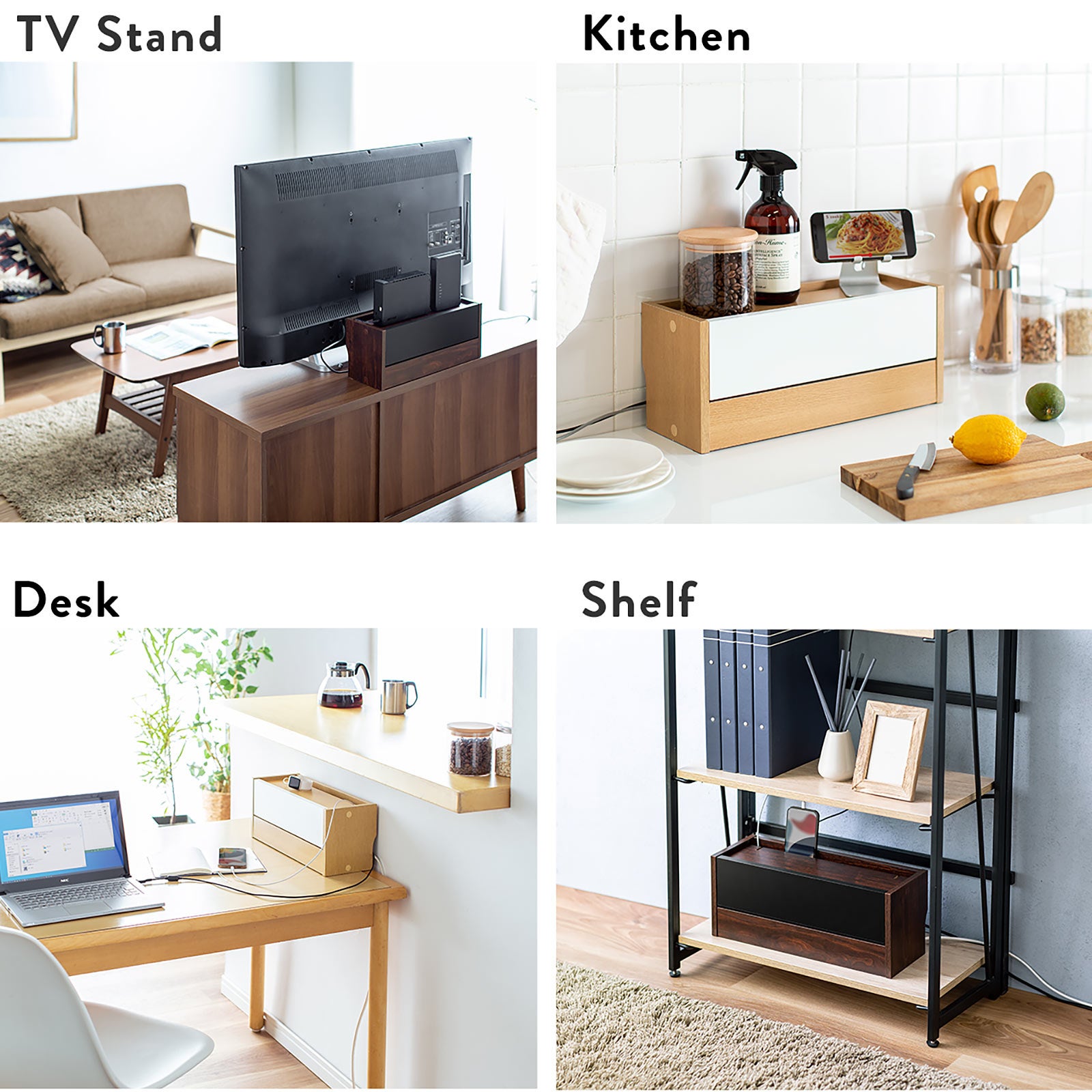 タップやケーブルなどを収納でき、スマホスタンドにもなるケーブルボックスを2月22日発売