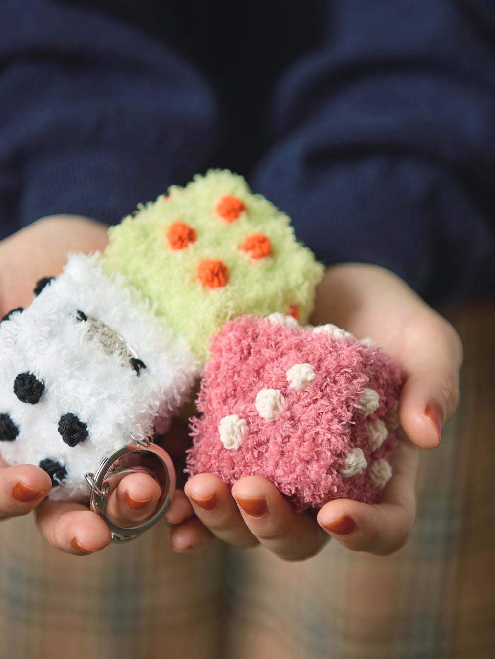 中でも「サイコロキーホルダー」はかぎ針をほとんど使わず、編み物用のメッシュシートにとじ針で毛糸を通していくだけの、編み物初心者がはじめやすい作品です。