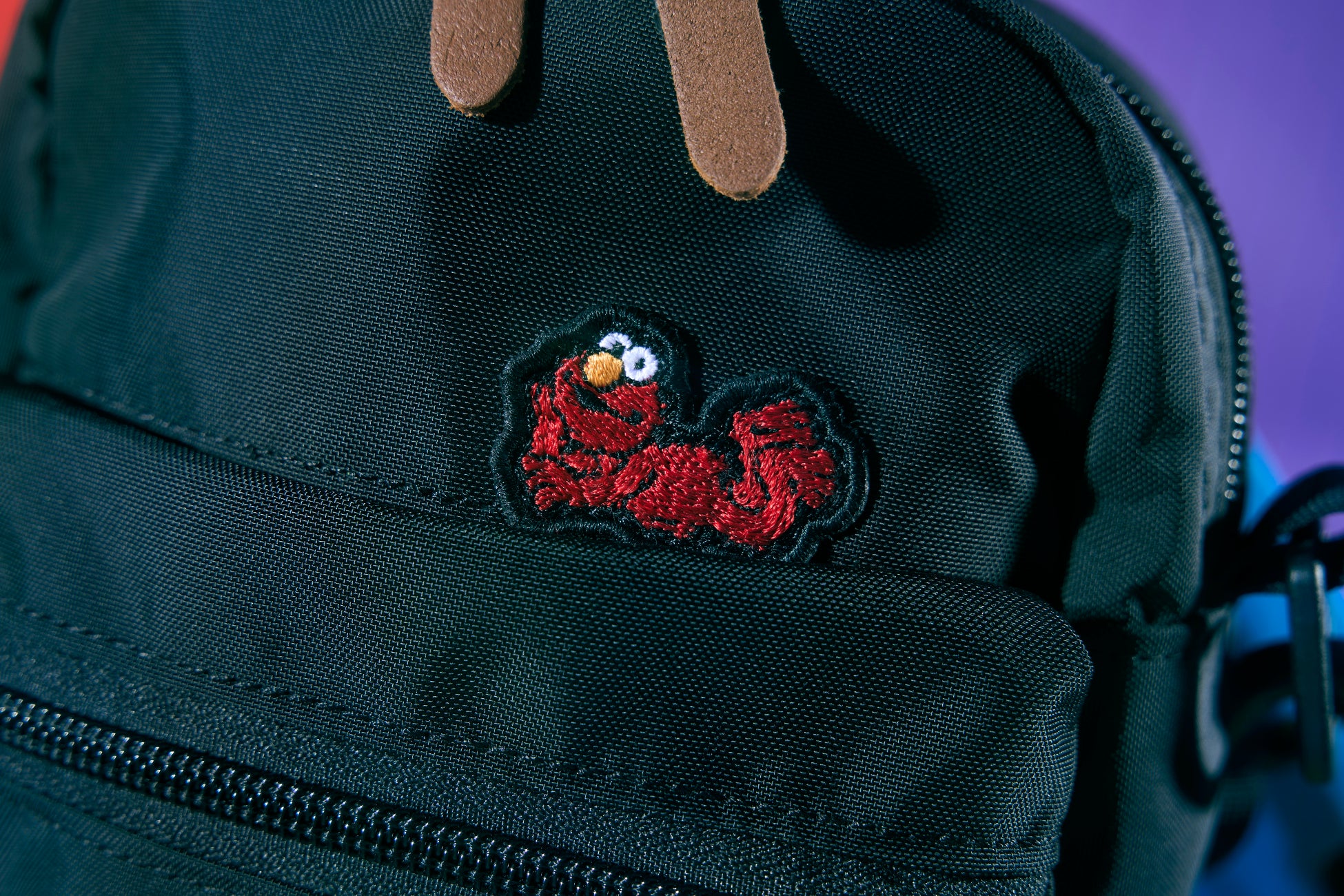 深みのあるグリーンにレトロなフローラルプリントが印象的なボディには、元気いっぱいのエルモと、ひょっこり顔をのぞかせるオスカーの刺繍があしらわれています。