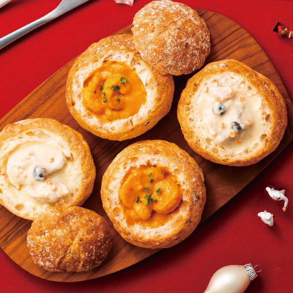 規格:( パン )直径約7.5cm×4個 (ソース)クリームチキン175g、海老のトマトクリーム176g