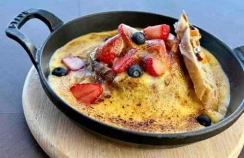 卵黄を使用したコクのあるサバイヨンクリームをたっぷりとかけ、オーブンで香ばしく焼き上げました。果実の甘酸っぱさと、とろりとしたクリームの口どけが重なり合う、昭和の喫茶店やホテルのデザートを思わせるどこか懐かしい味わいです。