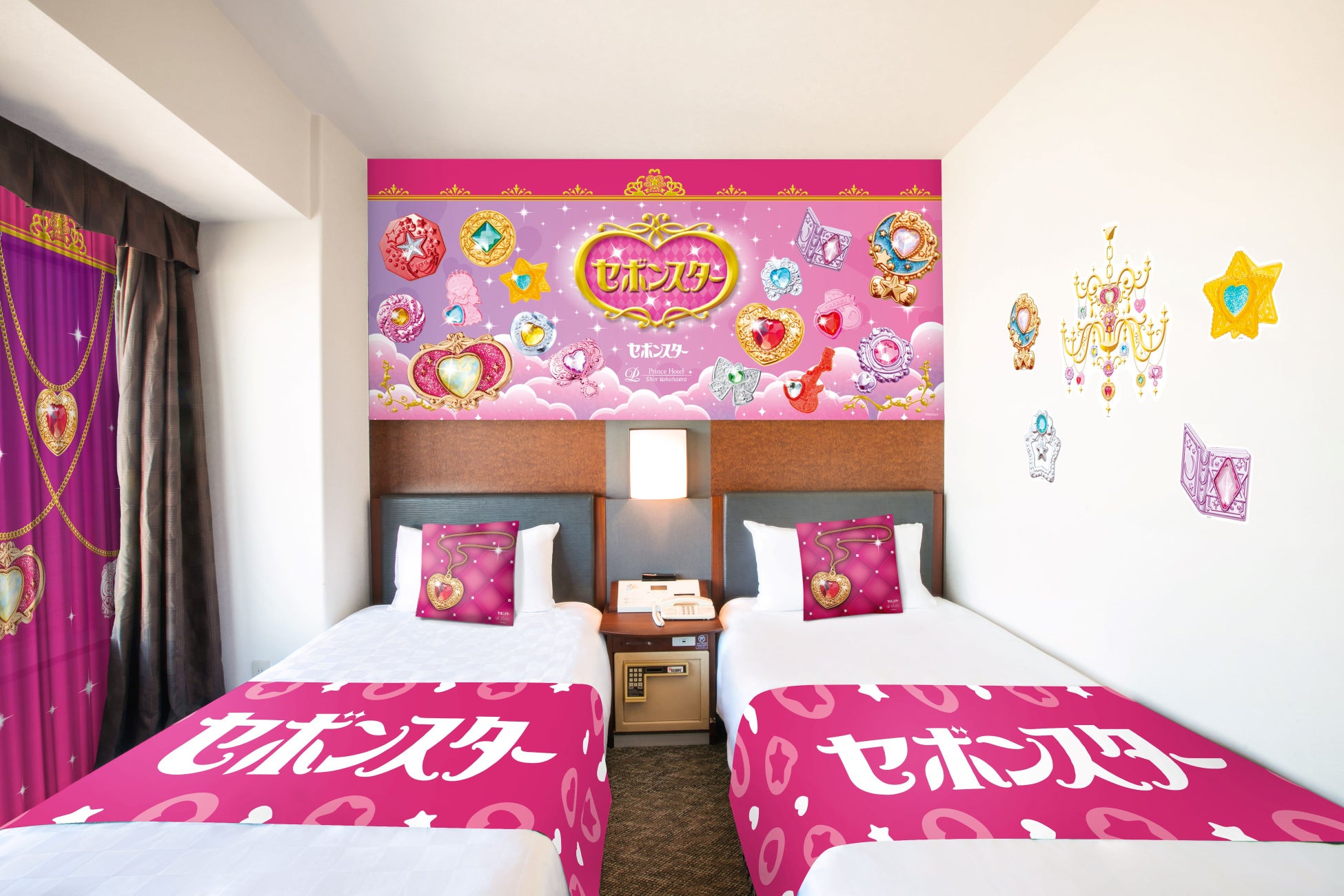 コンセプトルームは『セボンスター』のキラキラの世界観をテーマにした可愛らしい装飾が施されております。お部屋の至るところにペンダントのデザインをモチーフにした装飾がちりばめられ、『セボンスター』の世界観に浸りながらご滞在いただけるファンの憧れを具現化した空間です。