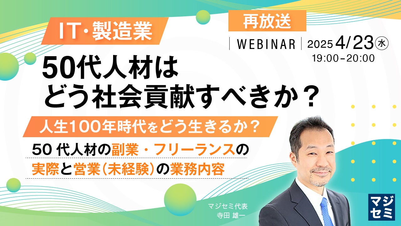 マジセミ株式会社は、大変好評をいただいた「【再放送】IT・製造業、50代人材はどう社会貢献すべきか?」というテーマのウェビナーを再放送します。