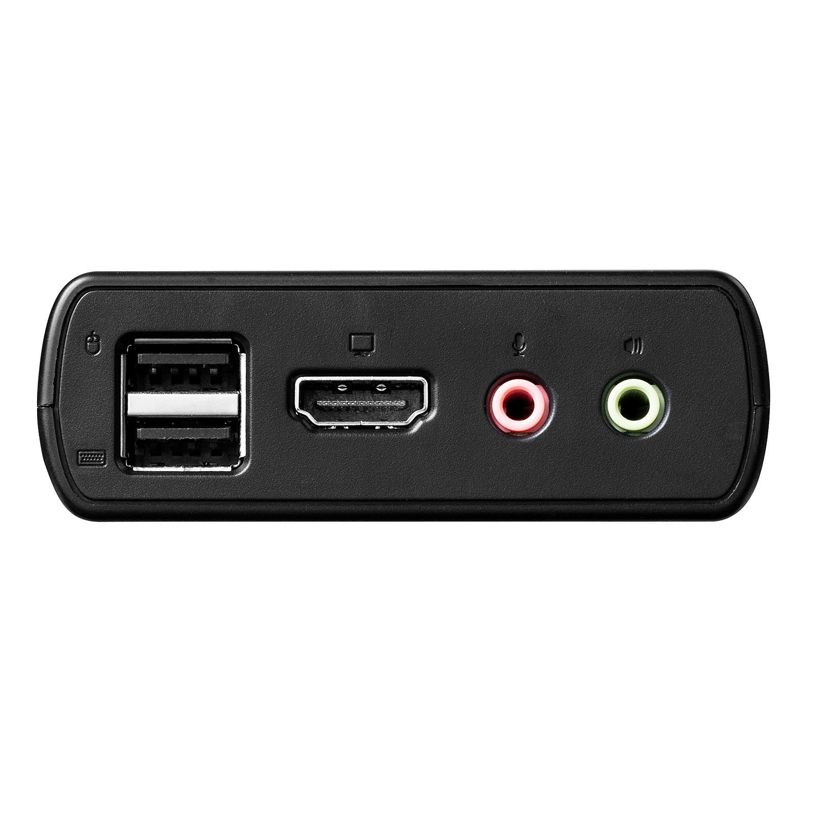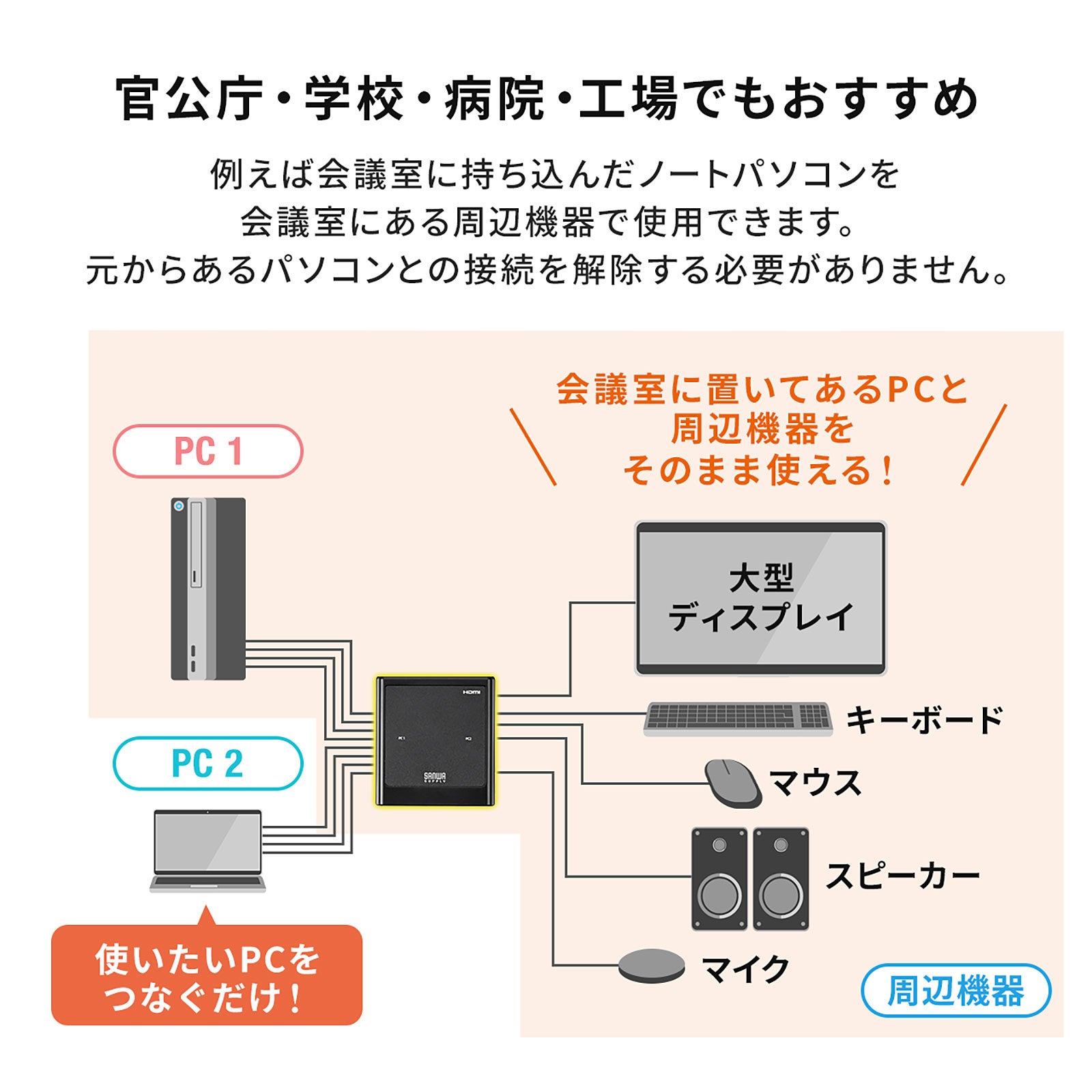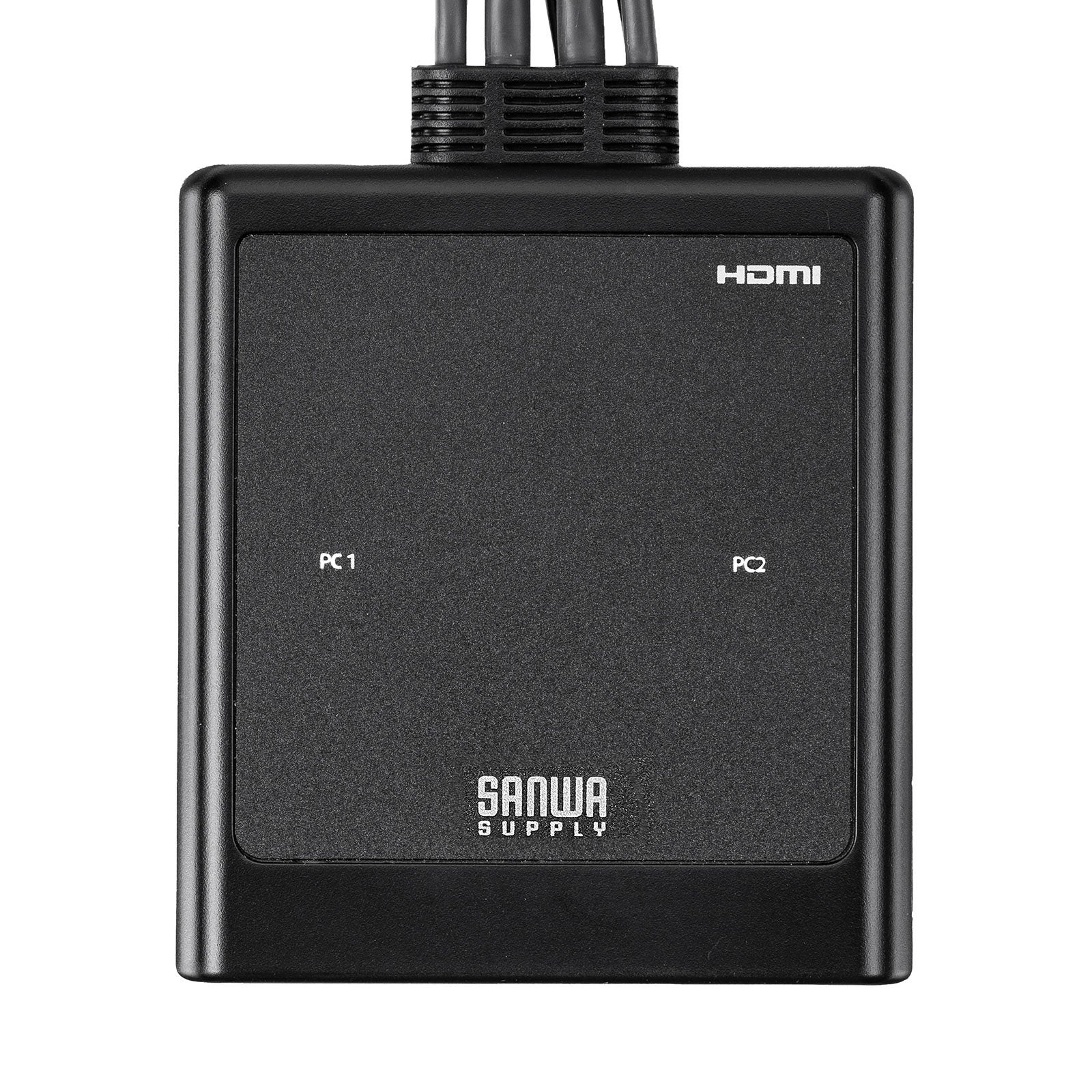 本製品は、2台のパソコンで1組のHDMIディスプレイ・USBキーボード・USBマウス・3.5mmプラグ接続のスピーカーおよびマイクを共有できるパソコン切替器です。