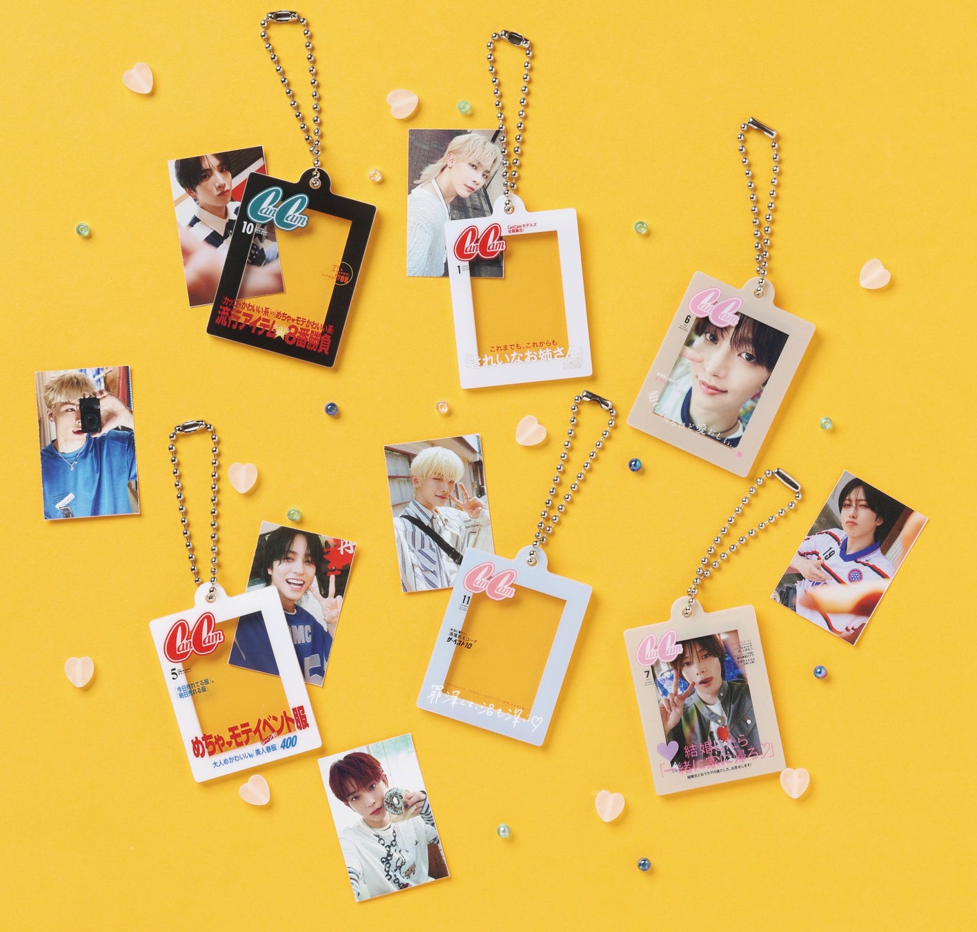 アクリルチャームはタテ約5cm×ヨコ約4cmの手の平サイズで、懐かしの2000年代から最新の表紙まで細かな文字もリアルに再現。CanCamらしい「ファッションテーマの表紙」と、推しに重ねたい印象的なキャッチコピーの「きゅん表紙」でそれぞれ3種類ずつ、計6種類のデザインをご用意しました。