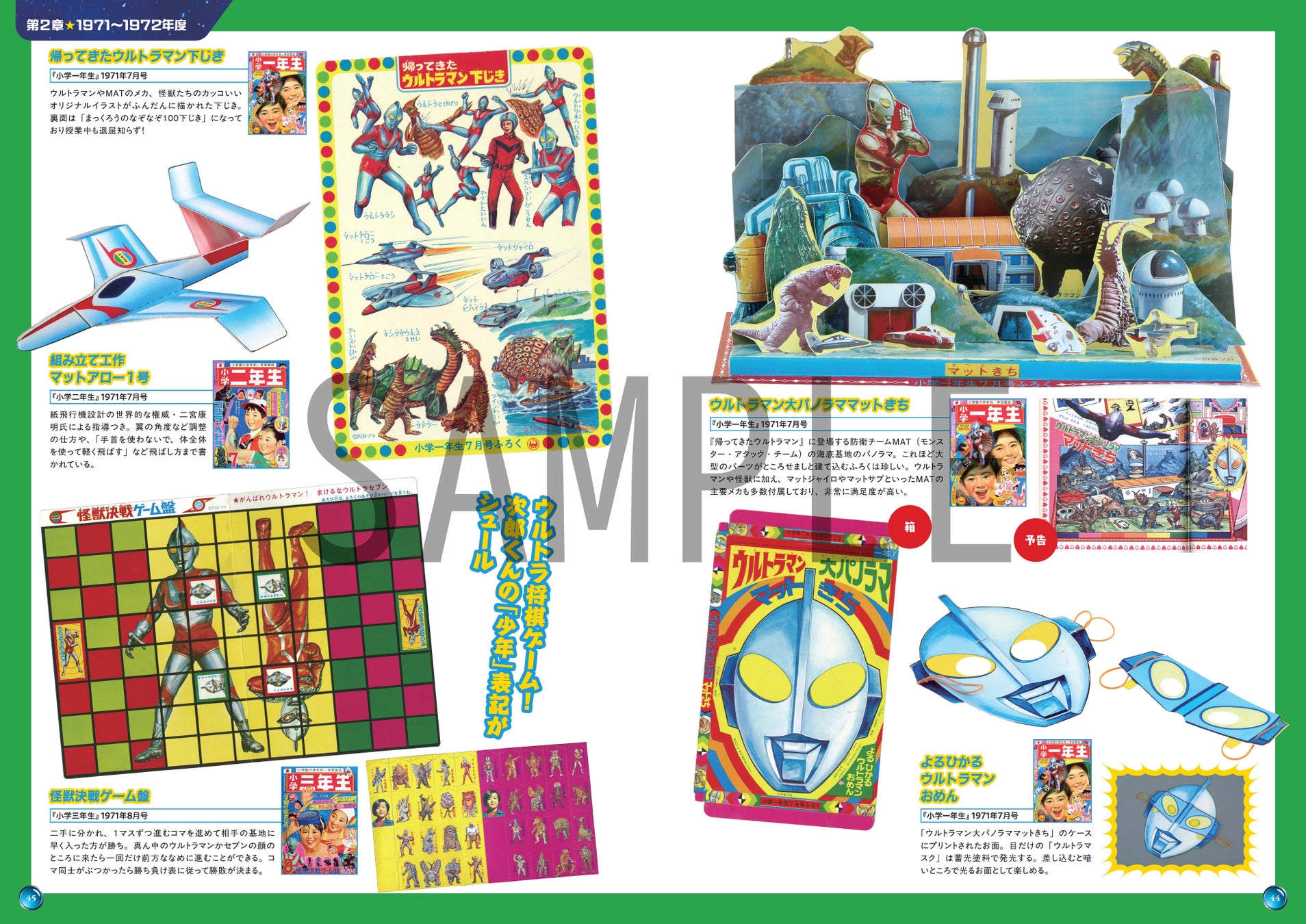 本書ではふろく全盛時代に収録されたウルトラマンシリーズの組み立てふろくを、網羅的に掲載します。組み立て済みふろくの写真と併せて、収録号の記事や次号予告、ふろくの箱絵なども抜粋して掲載することで、当時の雰囲気をそのままに感じることのできる内容となっています。