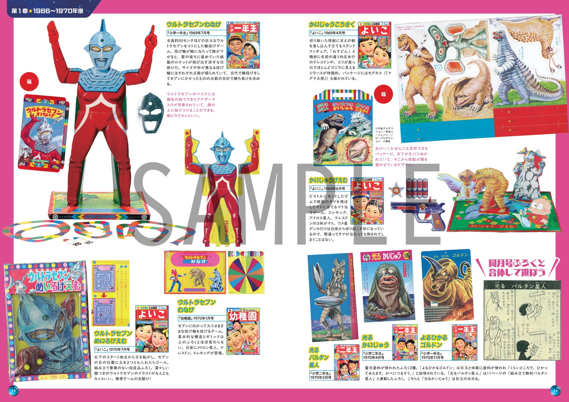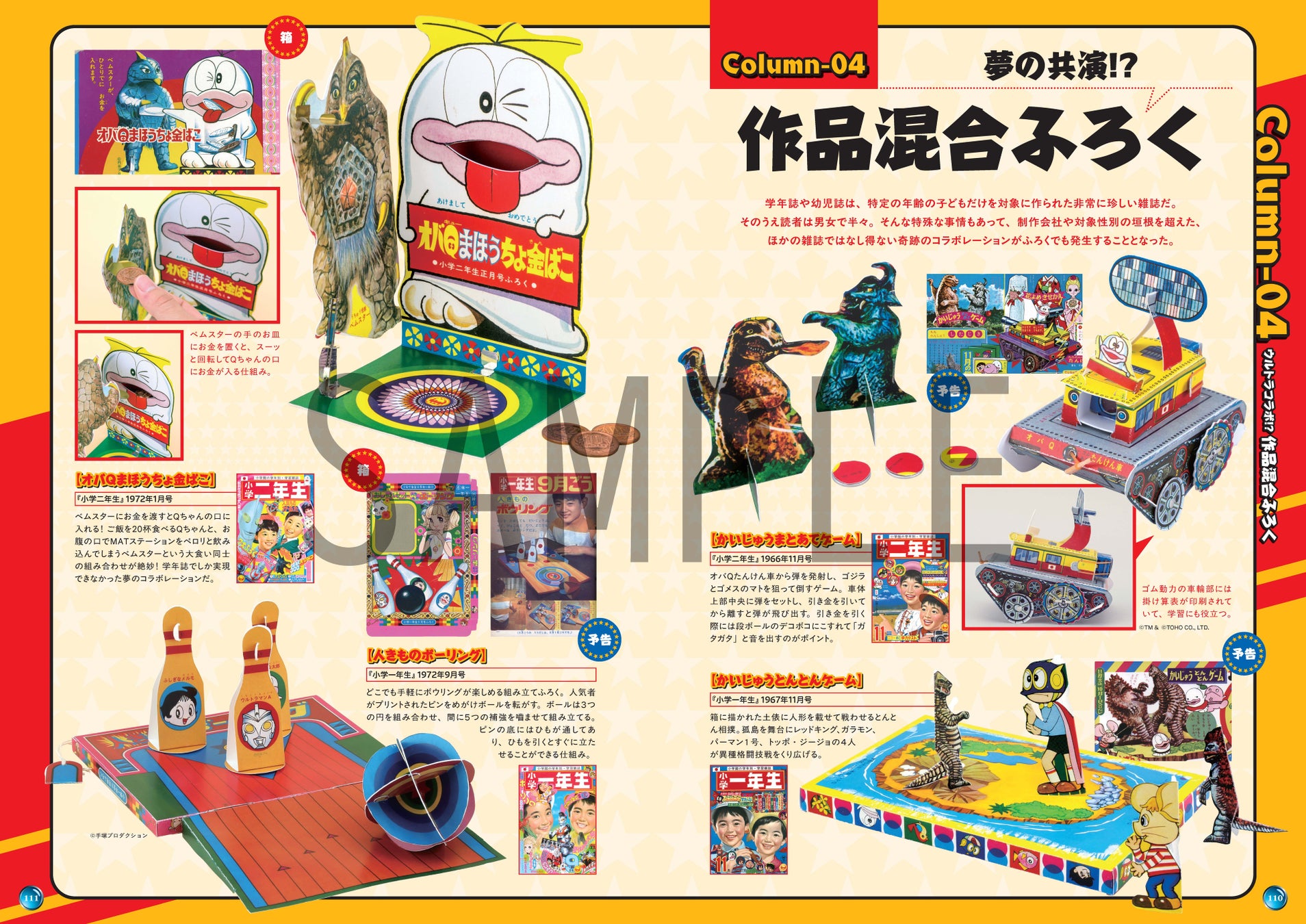 『小学一~六年生』のふろくにくわえ、『めばえ』『よいこ』『幼稚園』の幼児誌に収録されたふろくも掲載しており、その総数は200点以上! コラムではウルトラシリーズ以外の円谷作品ふろく、他作品との混合ふろく、別冊ふろくなども紹介しています。