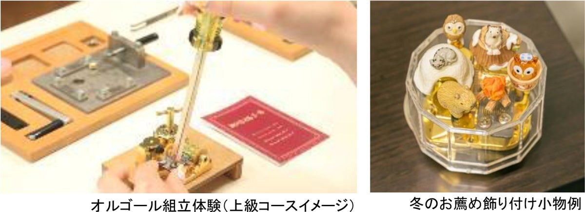 オルゴール職人のサポートのもと、自分だけの音色のオルゴール作りが体験できます。お好みの曲、ケース、コース(一般コース、上級コース)を選んで、完成したオルゴールは持ち帰りできます。下記日程は、特設のこたつ席(1台、先着順)で、あたたまりながらじっくり体験できます。冬にお薦めの飾りつけ小物もご用意しています。