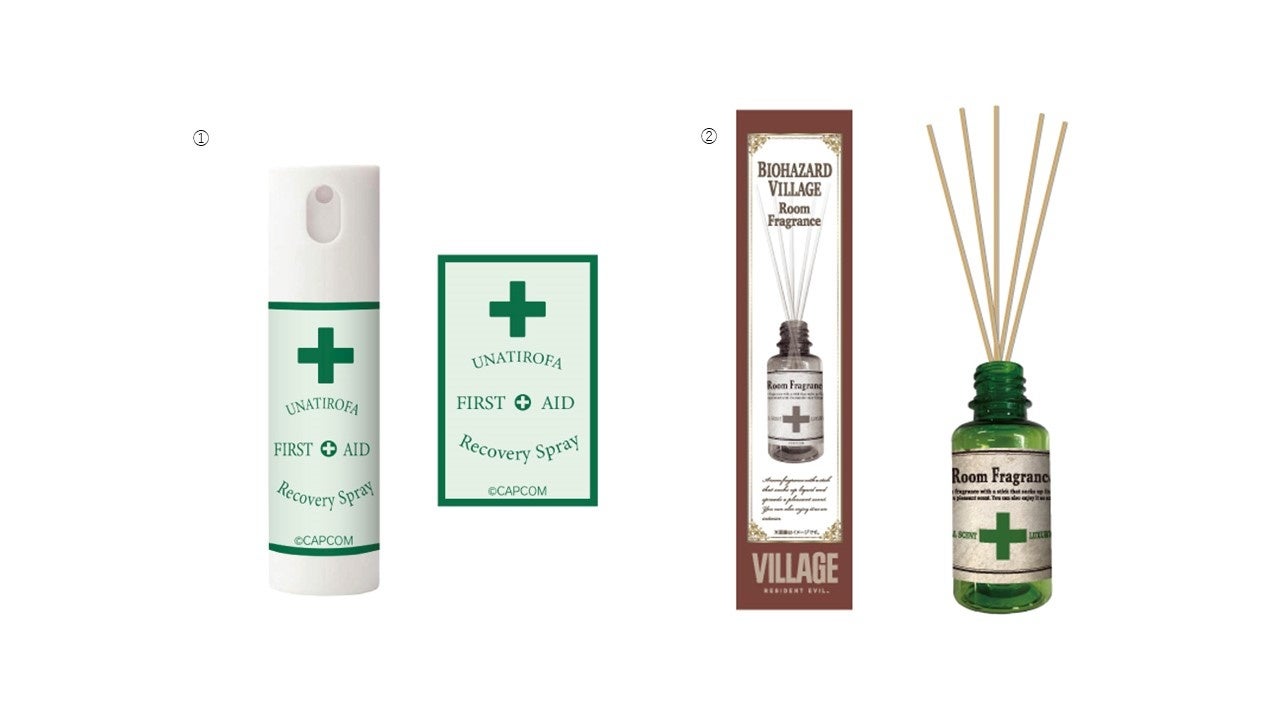 「バイオハザード」シリーズでのお馴染みのアイテム『救急スプレー』をイメージした「救急スプレーボトル」と、『バイオハザード ヴィレッジ』からは『回復薬』をイメージした「ルームフレグランス」が登場。