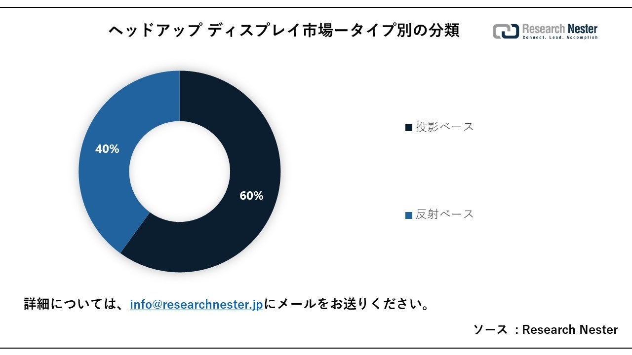さらに、市場は、コンポーネント別とタイプ別に分類されます。コンポーネント別はプロジェクター、コンバイナー、ビデオ生成コンピューターに分類されます。そして、タイプ別は従来型、拡張現実ベースに分類されます。