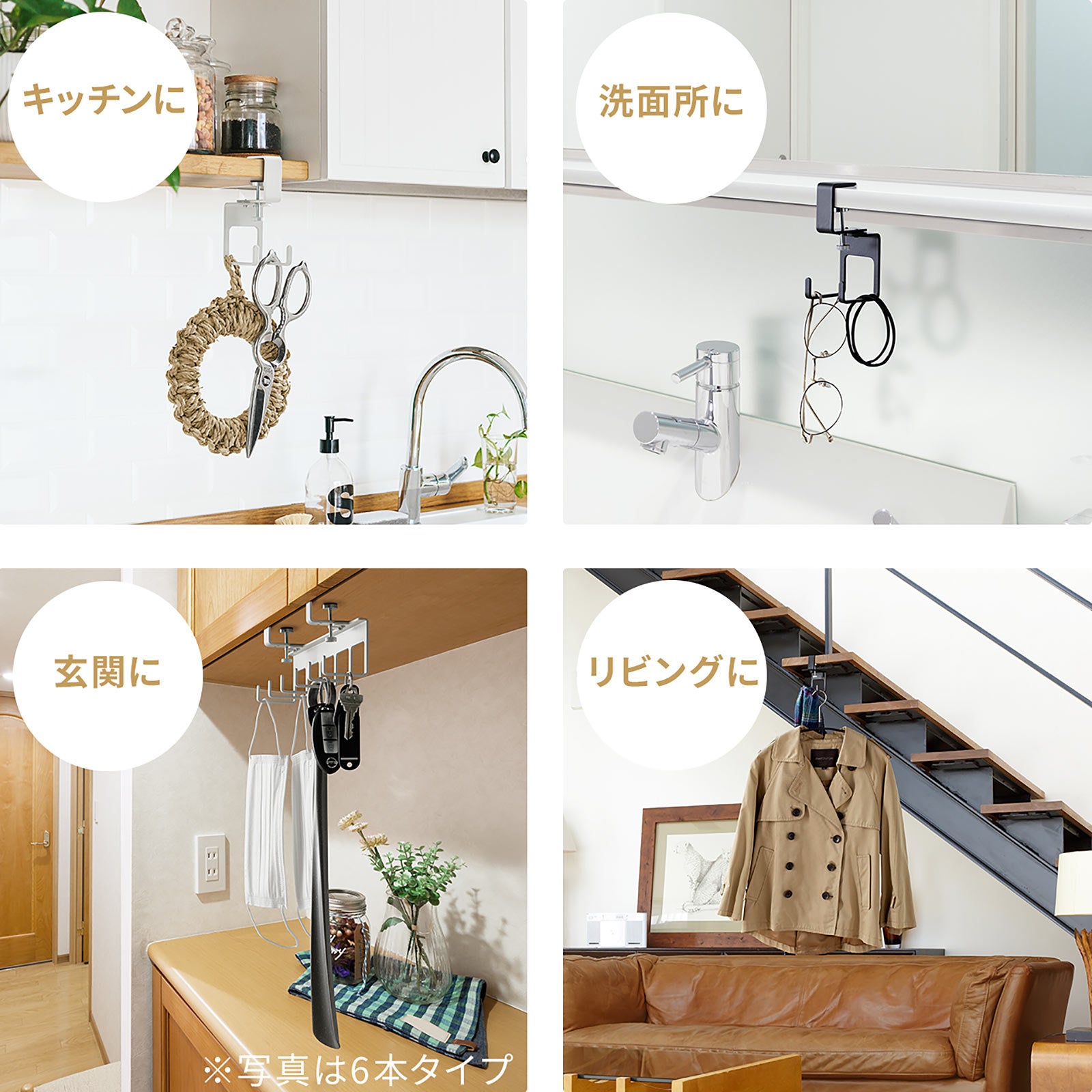 200-CB033シリーズはフックの向きは4方向、200-CB034/CB035シリーズは2方向で設定可能で、取り付け場所や引っ掛けるものに合わせて変更できます。