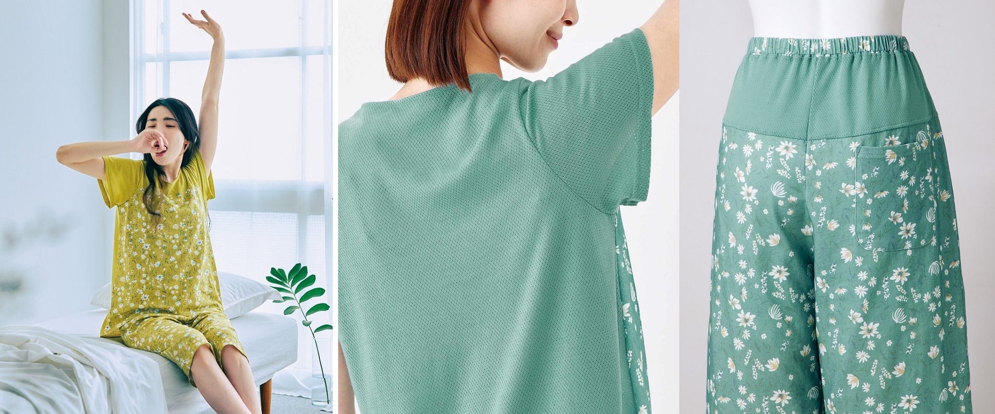 吸汗速乾の伸びやかな綿混素材をベースに、汗がたまりやすかったりむれやすい、背中全体・胸もと・腰まわりを、吸汗速乾のメッシュ素材にしたパジャマです。メッシュ素材が風を通します。パンツはひざが少し隠れるクロップド丈です。