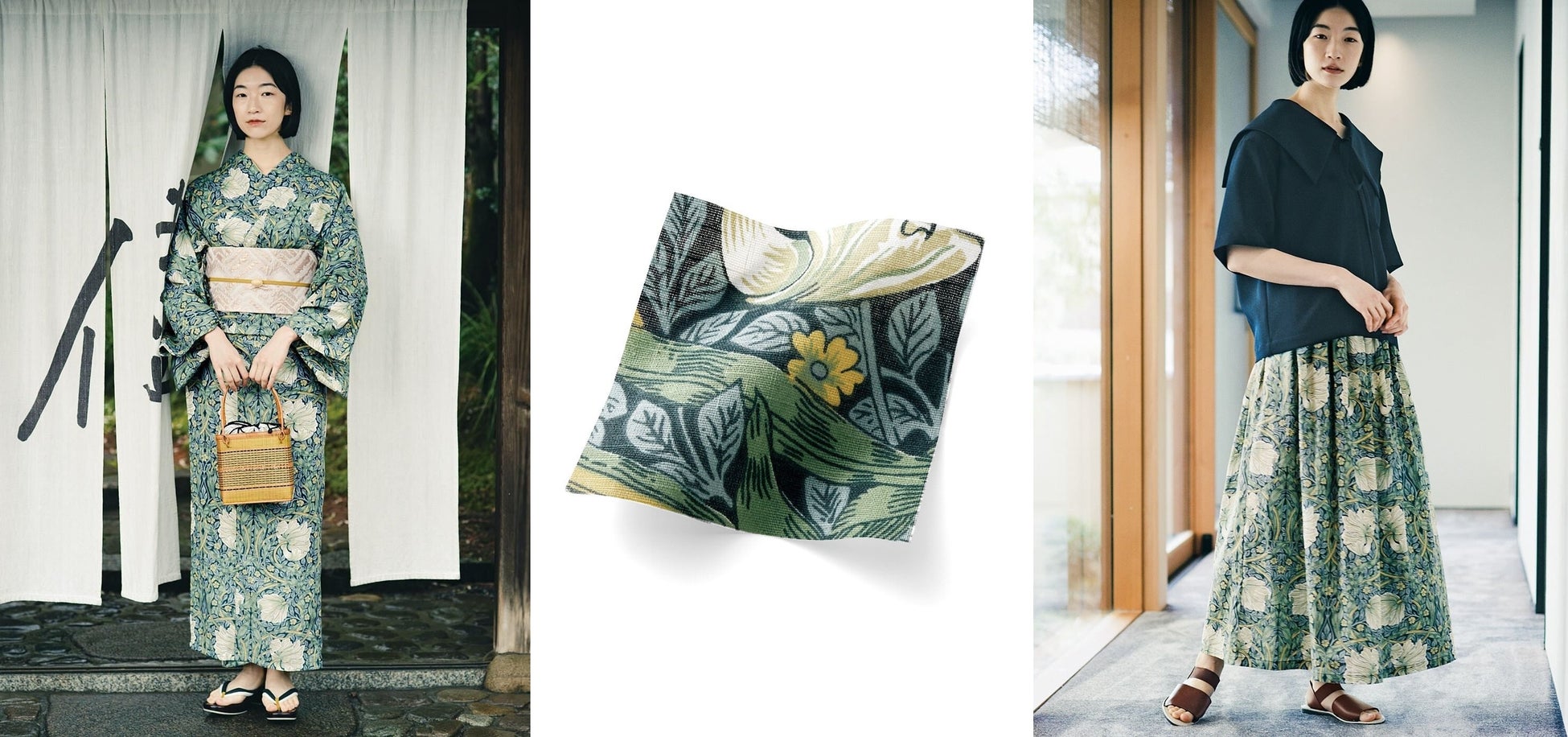 19世紀英国で活躍し、モダンデザインの父と称されたウィリアム・モリス。彼の人気柄〈ルリハコベ〉を、さらりとした肌ざわりのコットン100%織り生地にシルクプリントした、浴衣とロングスカートです。どちらも洗濯機洗いができるので、お手入れが簡単です。