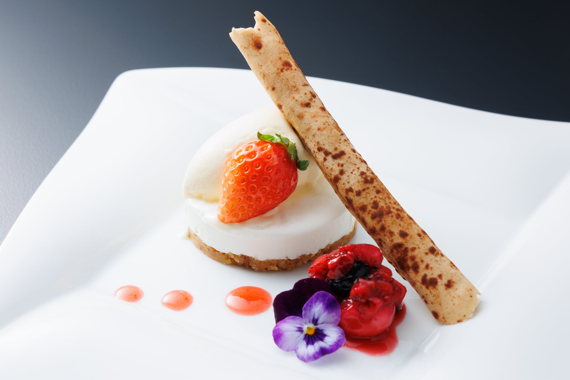 肉料理と魚料理のセットは、デザートプレートも充実。「チーズムース スターアニス香るベリーソース添え」など、季節ごとのスイーツをお楽しみいただけます。さらに一口サイズの可愛い小菓子をお好きなだけチョイスして、自分だけのデザートプレートを作ることも可能です。八女抹茶を使用したパウンドケーキや地元福岡の蜜柑を使用したクッキーなど、季節や素材にこだわった小菓子をご用意いたします。