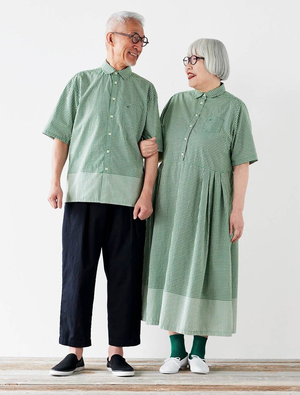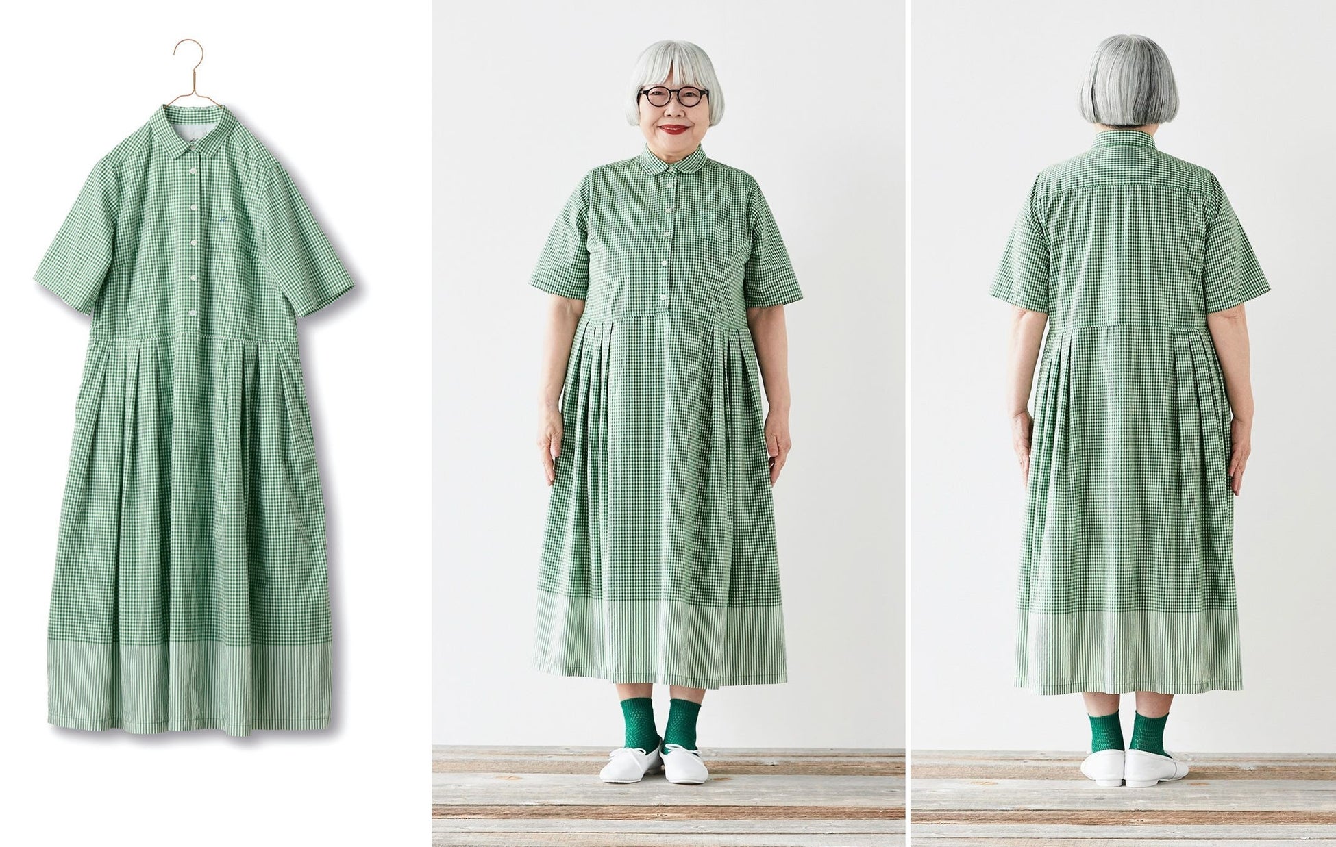 「緑のギンガムを使った服を作りましょう!」と決まり、いろんな緑色で作ったギンガムの中からおふたりがチョイスしたのは、夏の日差しを目一杯吸い込んだ、もぎたてのキュウリのような鮮やかなグリーンのギンガムでした。いままでは「夏でも長袖を着ることが多いです」とのことで、長袖をメインに作ってきましたが、去年の夏は仙台でも相当暑かったようです。もうおふたりとも長袖を着る気になれないということで、この夏のコラボアイテムはちょっと長めの半袖にしています。でも袖丈は長くして、ひじまで隠れるくらいの丈で作りました。すそ部分は横糸にグリーンを通すのをやめ、ストライプにしてポイントにしています。 from bonpon「今回は夏らしいさわやかな雰囲気のグリーンのギンガムチェックで、シャツとワンピースを作りました。これまでは夏でも長袖を着ていましたが、年々きびしくなる猛暑にたえられず、初めて半袖にしてみました! 気になる二の腕はしっかり隠れる長さと、すその部分がストライプになっているところがお気に入りです!!」