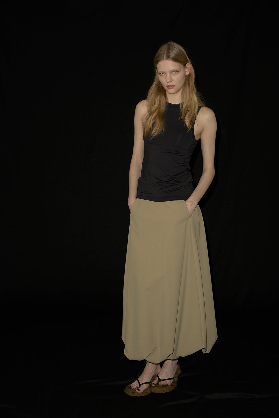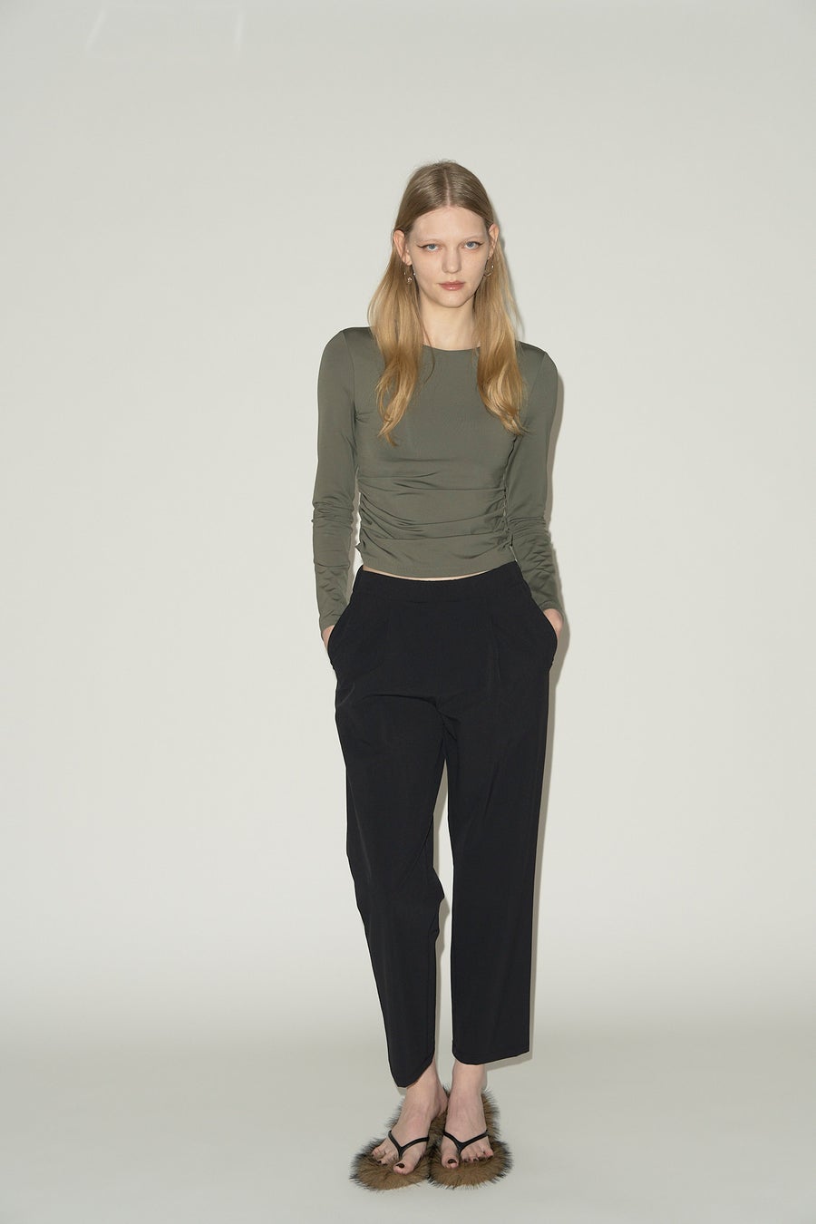 ウェストの両サイドにあしらったギャザーと手元のラインまで美しく見せてくれるカップ付きトップス。ジャケットやニットのレイヤードアイテムとしてもオールシーズン使えるアイテムです。
