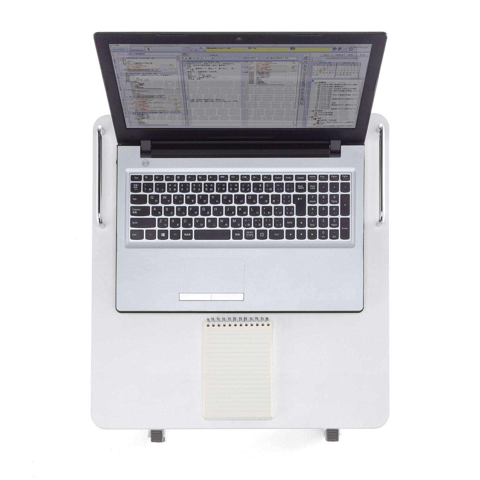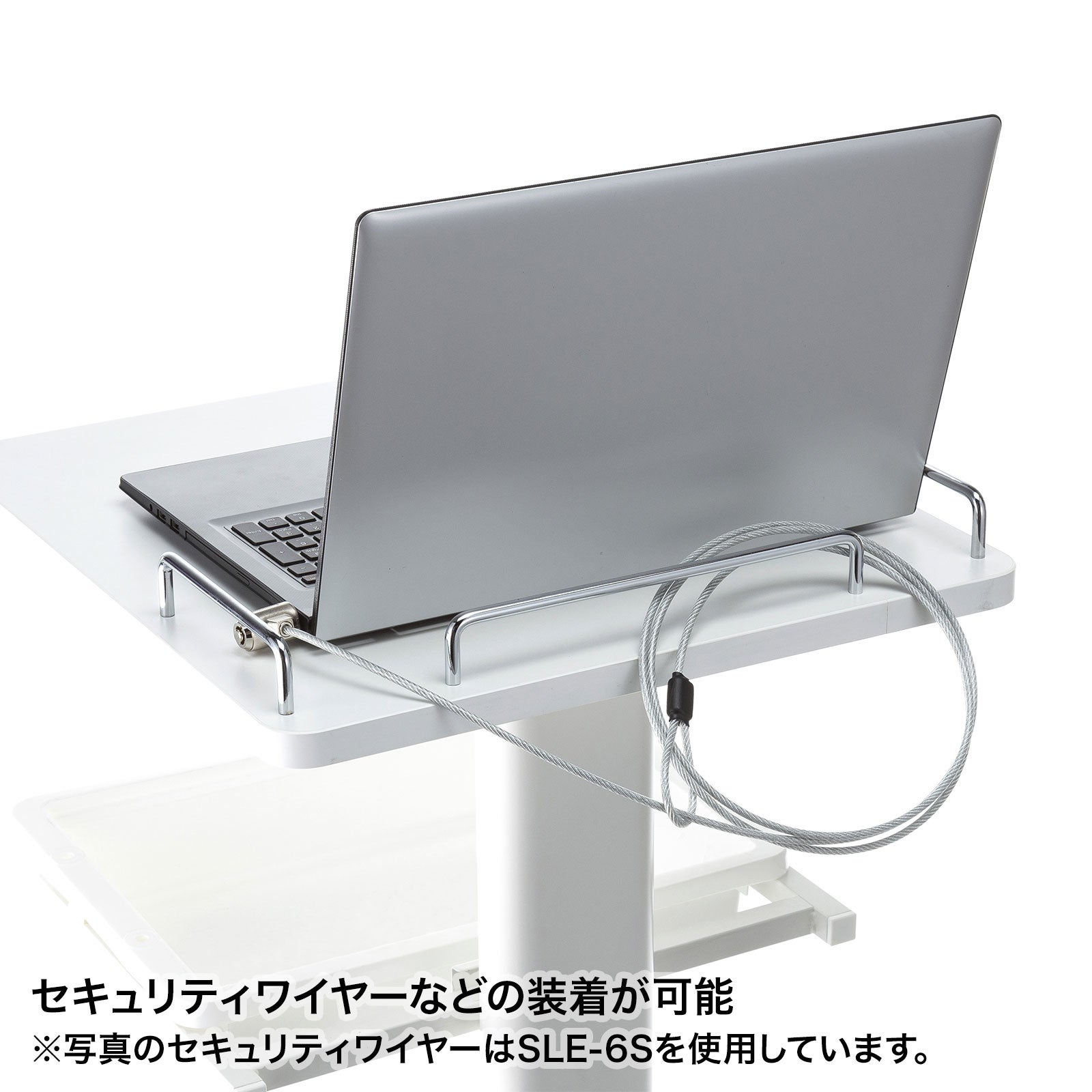 天板の有効寸法は幅422mm×奥行き476mmで、ノートパソコンを置いても手前にスペースを確保できます。また、落下防止バーがあり、天板上の機器などの落下を防ぐとともに、セキュリティワイヤーなどを装着して機器の不正な持ち出しの防止もできます。