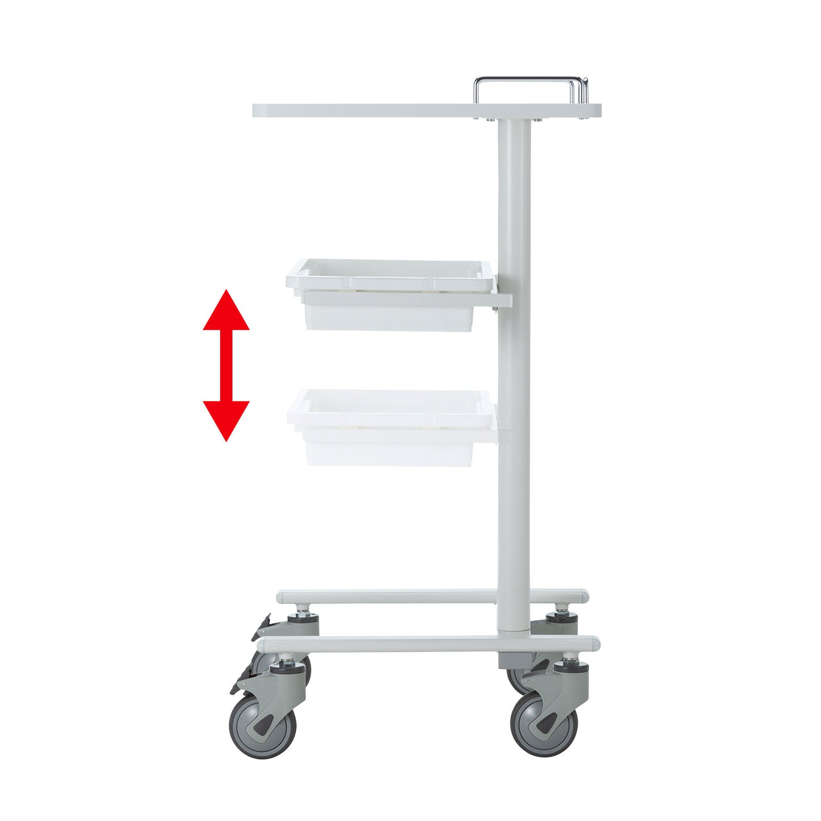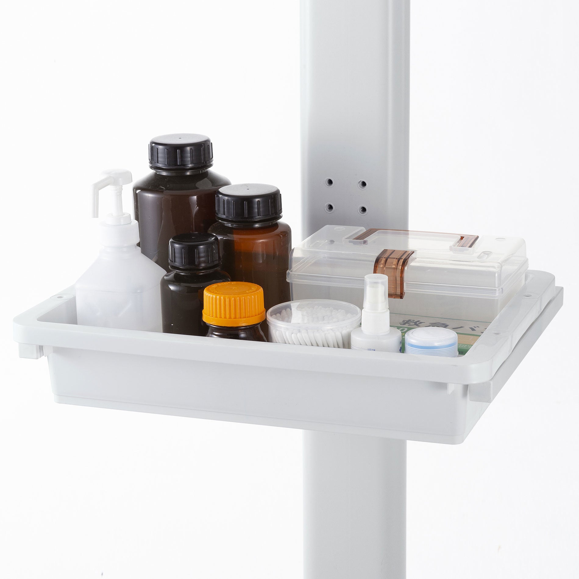 天板下のプラスチックトレーは取り外しが可能で、収納物や用途に応じて3段階での高さ設定が可能です。