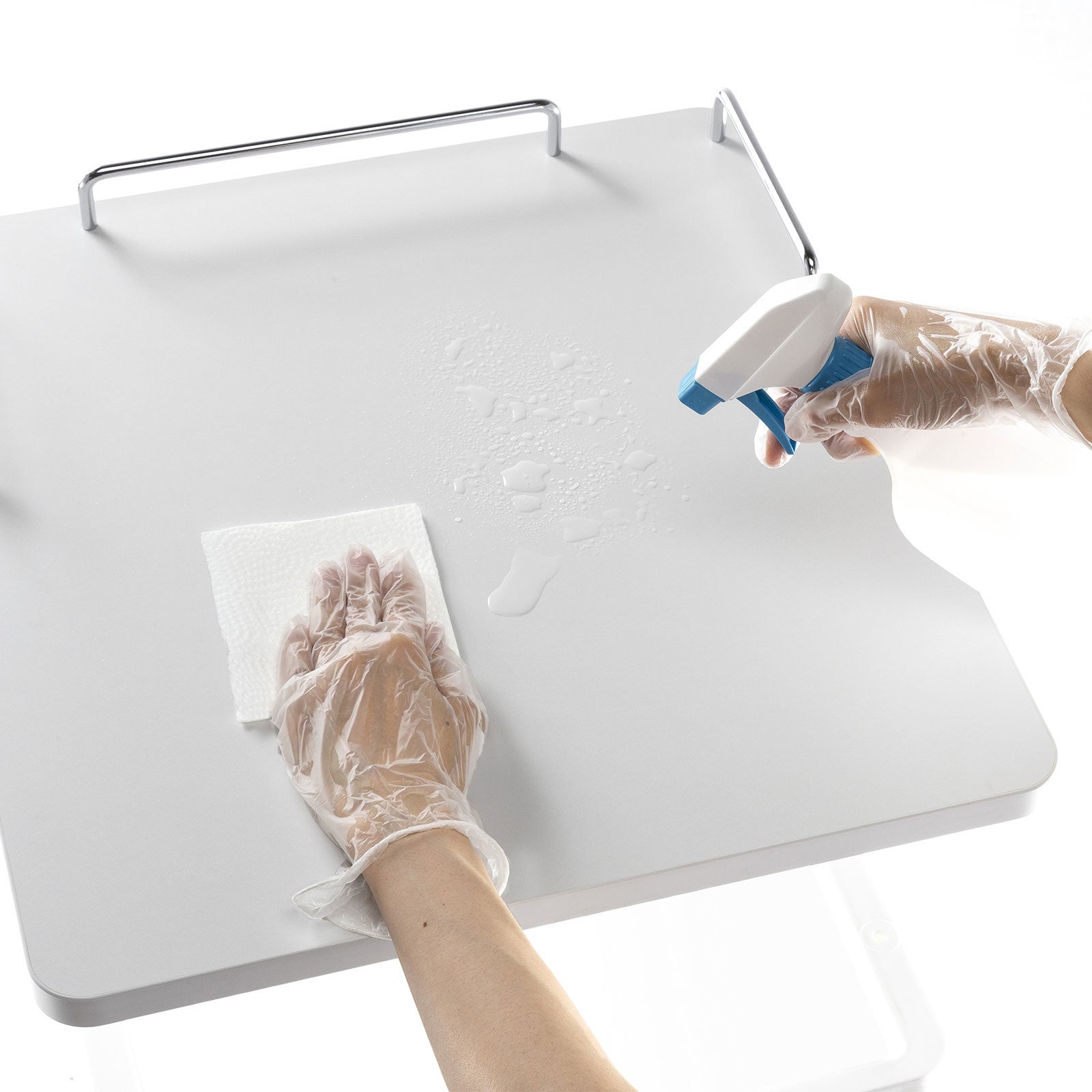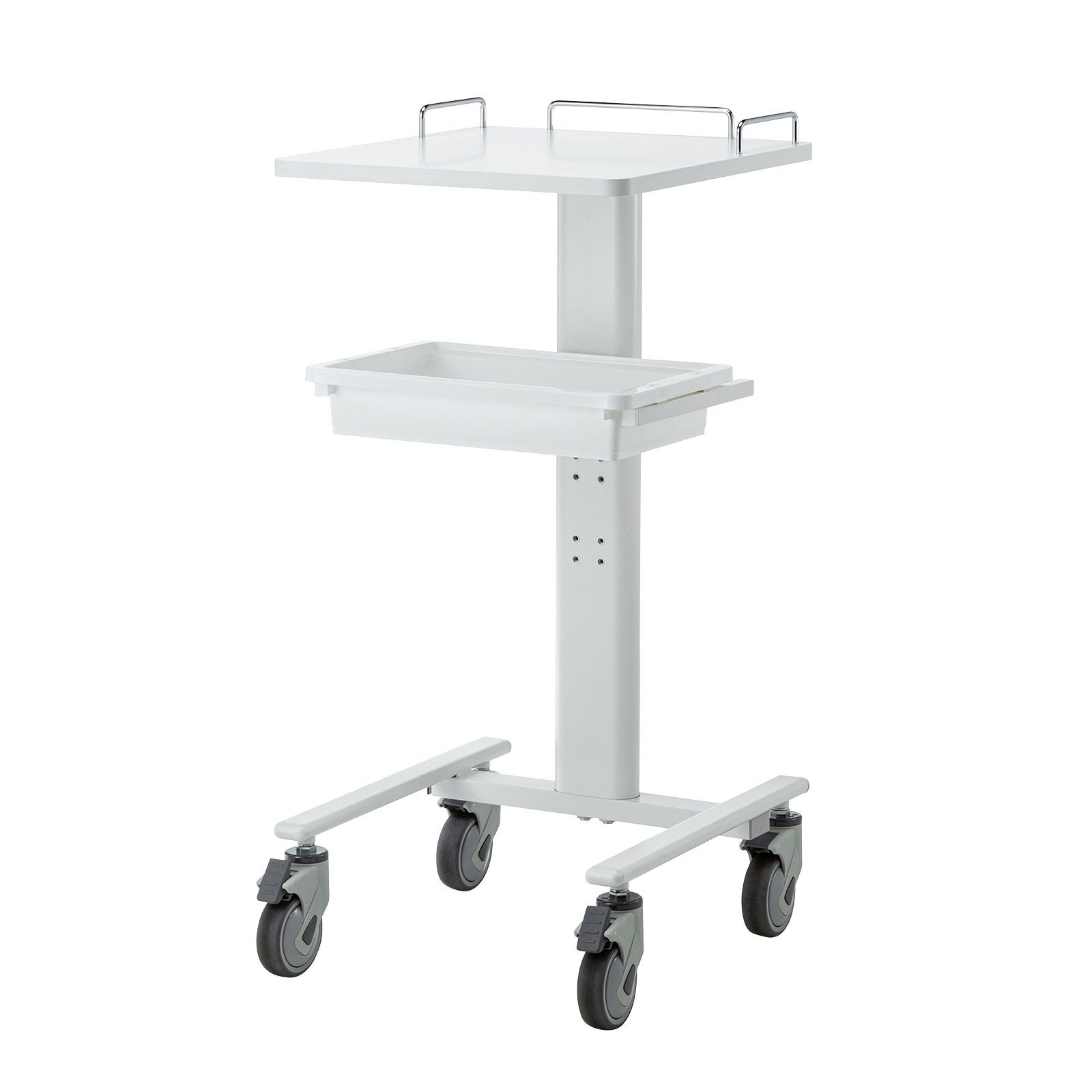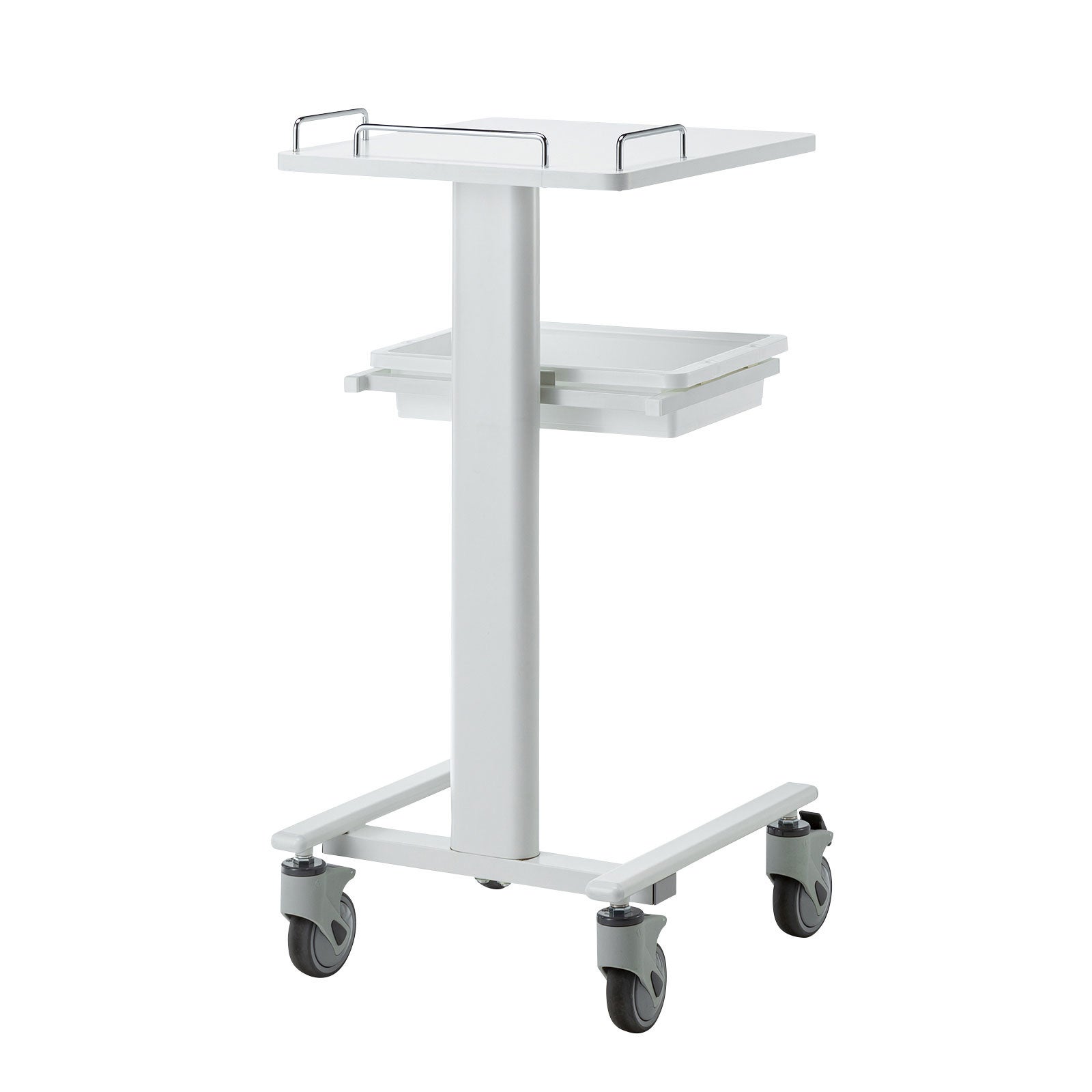 本製品は、院内のベッド周りなどの狭い場所でも取回しがしやすい1本支柱タイプです。天板や脚部は、当たってもケガをしにくいよう角を削ぎ落したデザインになっています。
