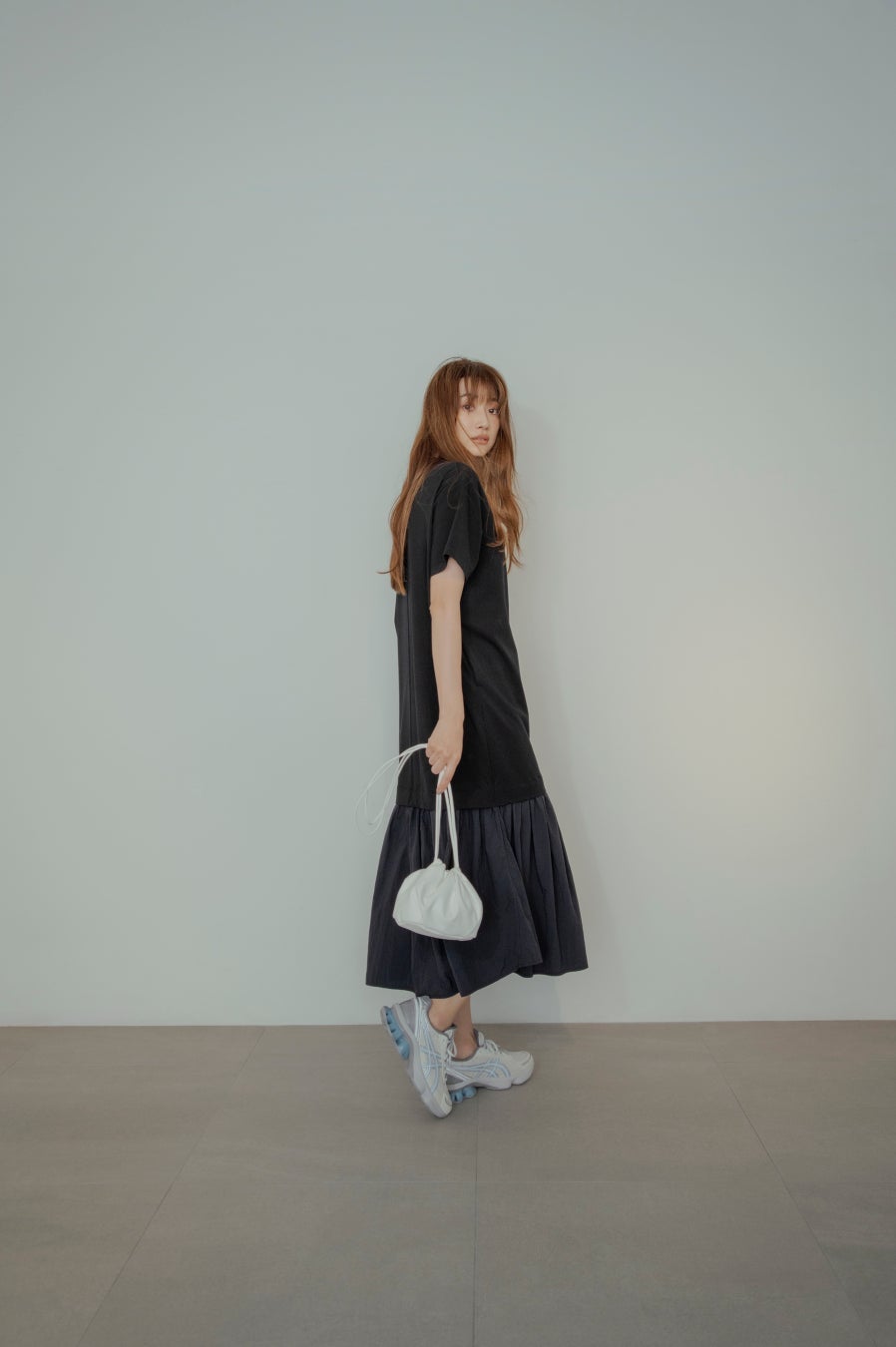 さらりとした綺麗めのTシャツに、ナイロン素材のボリュームスカートを組み合わせたemmiならではのドッキングワンピース。カジュアルな雰囲気ながら、スカートの程よいボリューム感が女性らしいシルエットを演出します。スタイリングいらずで一枚で着映えて、シワになりにくい素材のためデイリーシーンはもちろんご旅行にもおすすめです。