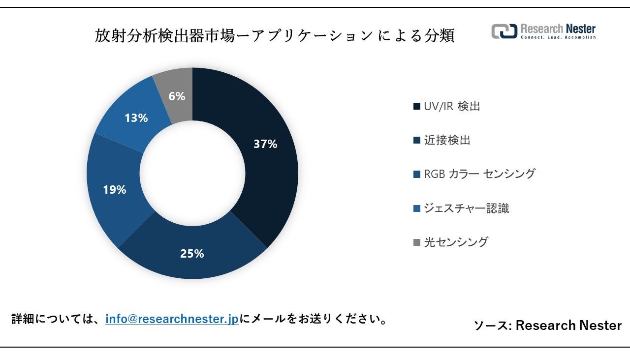 市場はアプリケーションによって、近接検出、RGB カラー センシング、ジェスチャー認識、光センシング、UV/IR 検出に分割されています。これらのうち、UV/IR 検出セグメントは、可視光からの電磁放射を測定するためのデバイスの使用率が高いため、世界の放射分析検出器市場で最大のシェアを保持すると予想されます。これとは別に、放射分析検出器は、定義されたスペクトル範囲内のスペクトル広帯域放射照度測定にも使用されます。これは、将来的に市場セグメントの成長を促進すると予測されています。