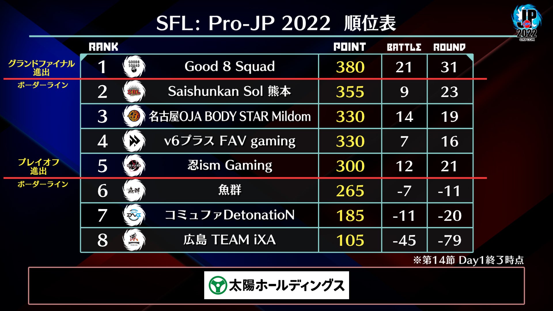 「ストリートファイターリーグ: Pro-JP 2022」リーグ本節終了後、本節2位から5位のチームが「プレイオフ」へ進出、さらに「プレイオフ」を勝ち上がった上位2チームと、本節1位のチームが決勝大会である「グランドファイナル」へ進出し、2022年シーズンの優勝と、総額800万円の賞金を懸けて激突します。