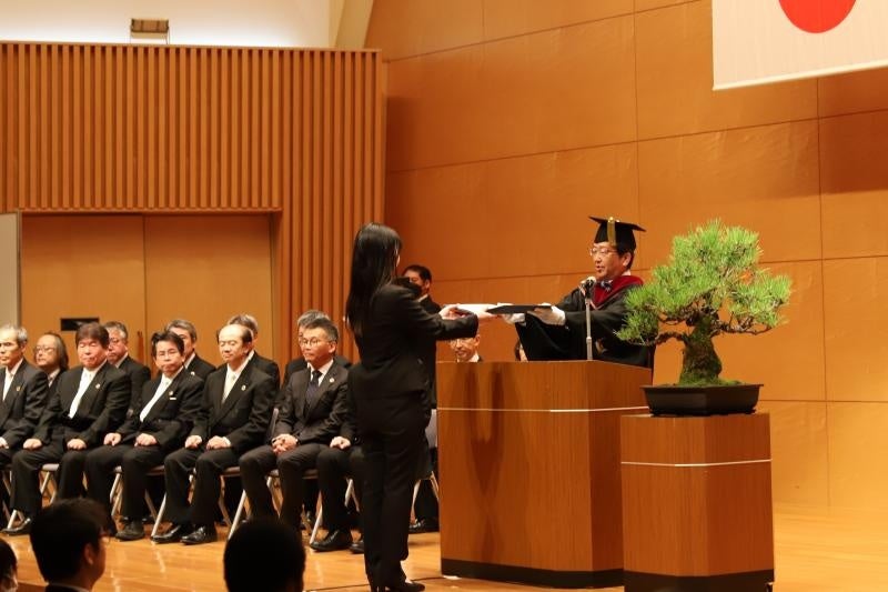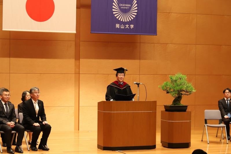 那須学長は英語で式辞を述べ、「FUEKI-RYUKO(不易流行)」と「OKADAI-LOVE(岡大愛)」の2つの言葉を卒業生・修了生へ贈り、「I want you to keep OKADAI-LOVE even after the graduation today. We hope that you will be proud of what you have learned at OKADAI and what you have accomplished in obtaining your respective degrees.(今日の卒業・修了を迎えた後も、岡大愛を忘れずに大切にしていてほしいと思います。そして、皆さんが岡大で学んだこと、そして得た学位を誇りに思い続けてくれることを願っています)」と卒業生にメッセージを送りました。