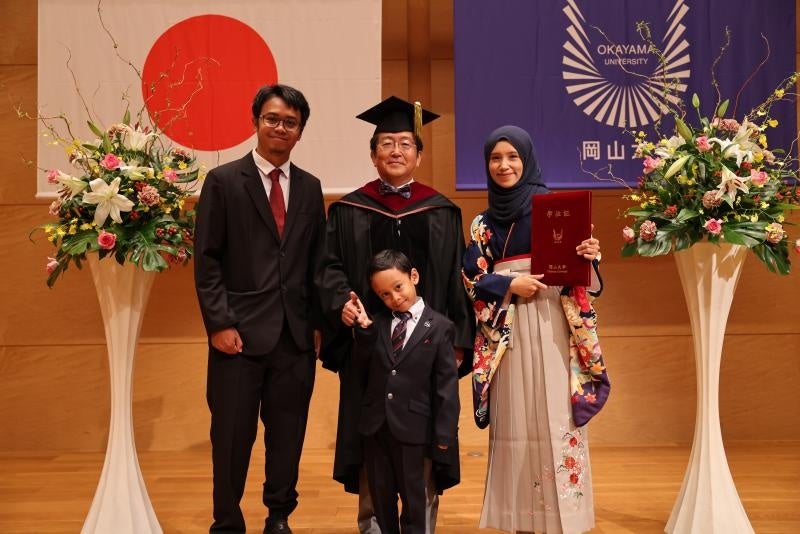 式後、那須学長は会場で、スーツや各国の礼服を着た卒業生たちと共に記念撮影を行いました。卒業生たちは、友人や家族と共に思い出深い場所を訪れながら、これからの新しい挑戦に向けての決意を新たにしていました。引き続き、地域中核・特色ある研究大学:岡山大学と巣だった岡大生らの取り組みにご期待ください。
