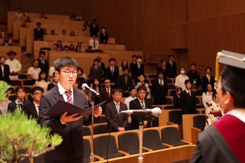 卒業生・修了生を代表して、大学院自然科学研究科のWANG JINGさんが「To Okayama University, thank you for providing world-class education, advanced research facilities, and opportunities to broaden our horizons. Today is not the finish line, but the first step toward what lies ahead. The future may be uncertain, but we have already proven that we can rise. Let us move forward with open hearts, ready for whatever comes next.(世界水準の教育、最先端の研究施設、そして私たちの視野を広げる貴重な機会を提供してくださった岡山大学へ心より感謝しています。今日という日はゴールではなく、これから待ち受けている挑戦に向けた第一歩です。未来が不確実であっても、私たちはすでにどんな困難にも立ち向かう力を備えていることを証明しました。これから何が起ころうとも、心を開き、ともに前進してまいりましょう)」と、答辞を述べました。