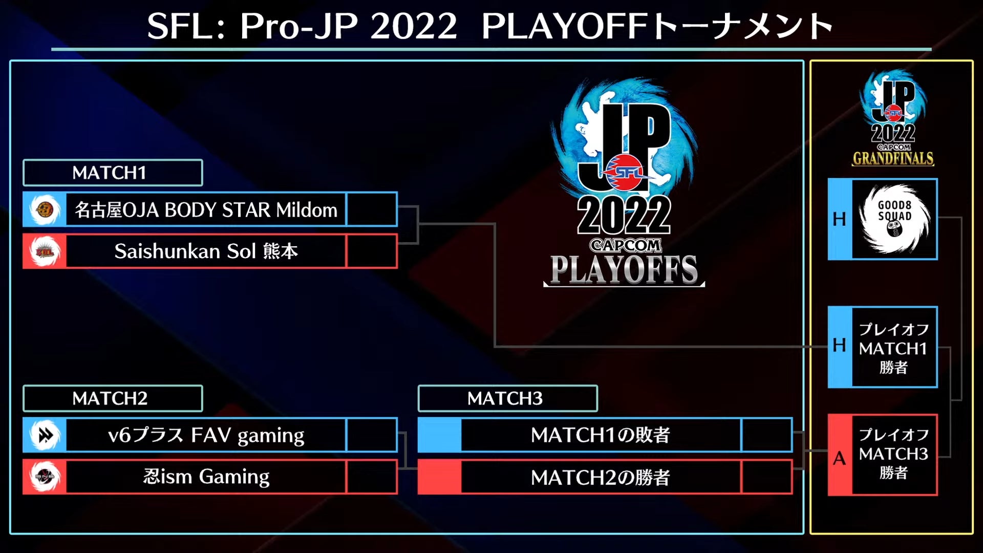 「ストリートファイターリーグ: Pro-JP 2022」リーグ本節終了後、本節2位から5位のチームが「プレイオフ」へ進出、さらに「プレイオフ」を勝ち上がった上位2チームと、本節1位のチームが決勝大会である「グランドファイナル」へ進出し、2022年シーズンの優勝と、総額800万円の賞金を懸けて激突します。