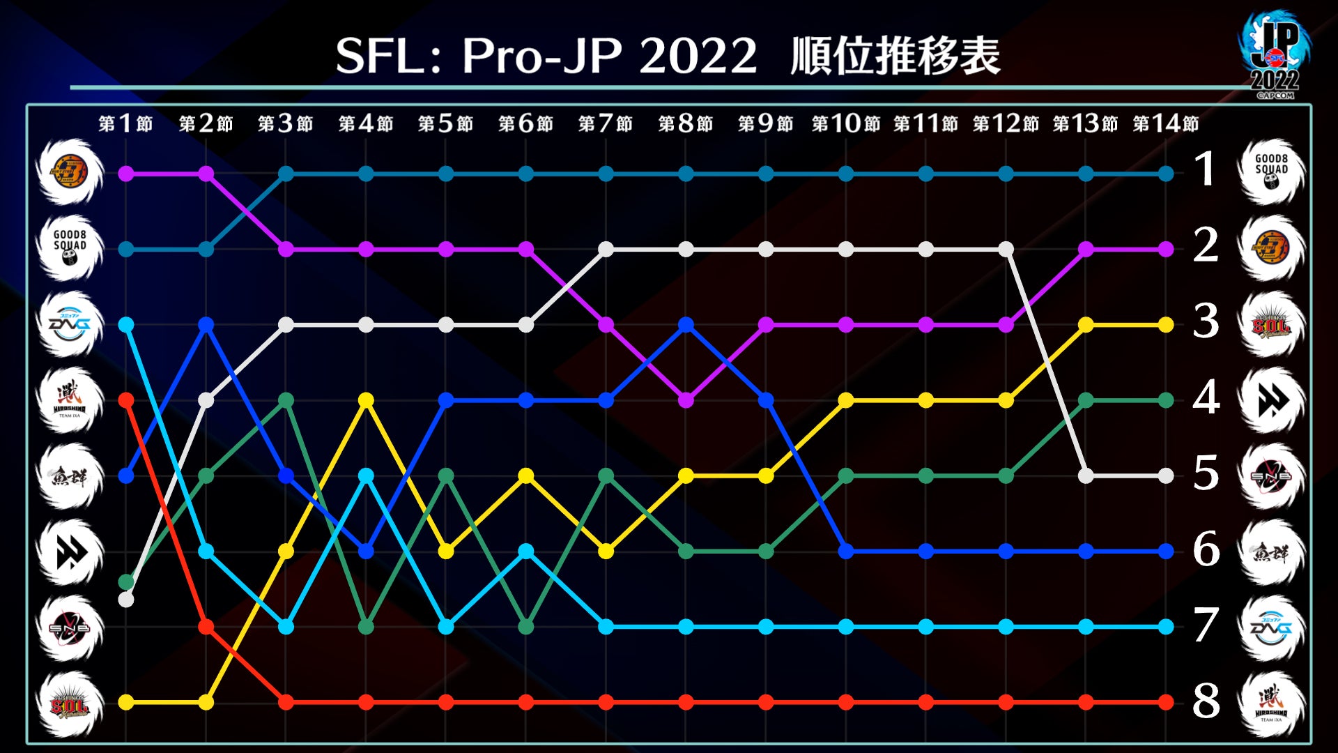 全14節を戦い抜きリーグ本節1位となった「Good 8 Squad」は、2年連続の本節1位通過という快挙を成し遂げ、翌年1月21日(土)に開催されるグランドファイナル進出を決めた。グランドファイナルにて挑戦者を待つ形となる。
