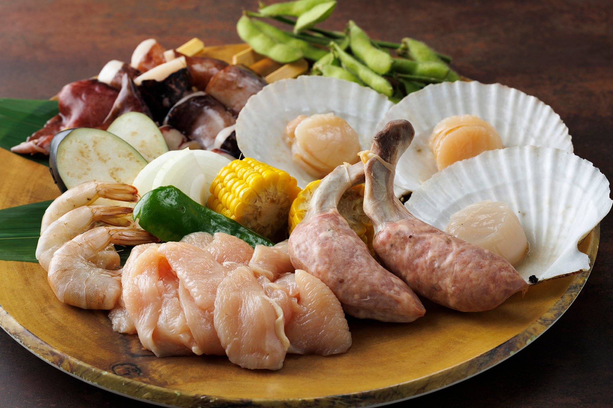 豚カルビ/ごま風味チキン/骨付きフランク/エビ/イカ/帆立貝/つぶ貝/ムール貝/野菜各種/アンチョビキャベツ/オニオンガーリック/アヒージョ/きのこじゃがバター