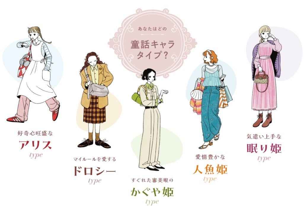 診断方法は、数問の回答で結果が分かります。診断結果は、童話に登場する「アリス」「ドロシー」「かぐや姫」「人魚姫」「眠り姫」の5つのキャラクターでタイプ判断され、隠れた自分の気持ちを理解することができます。診断結果をもとに、これからの季節に着たいファッションのアドバイスやおすすめのアイテム、コンテンツが紹介されるので、すぐに実践することができます。