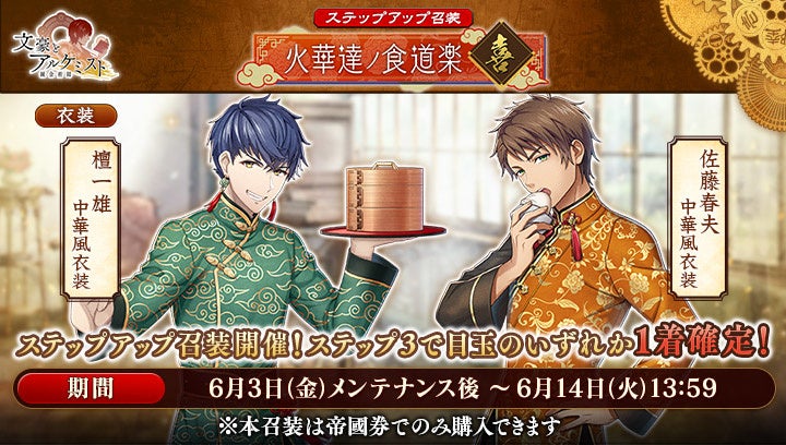文豪の「衣装」や、会派に装備する事で能力を強化できる「装像」などが入手できるコンテンツ「召装」に、限定召装「火華達ノ食道楽・喜」が期間限定で登場します。この召装では新しく追加された檀一雄と佐藤春夫の〈中華風衣装〉を獲得できます。