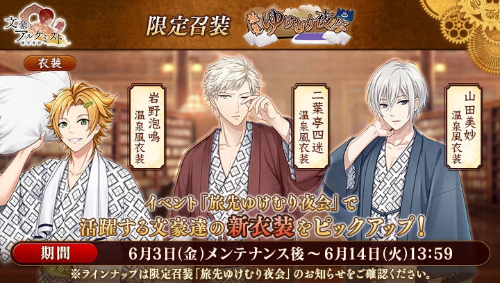 さらに、イベントと同時に開催される限定召装『旅先ゆけむり夜会』にて新規追加された「岩野泡鳴」「二葉亭四迷」「山田美妙」の〈温泉風衣装〉を編成すると、得点の獲得率がそれぞれ30%上昇します。