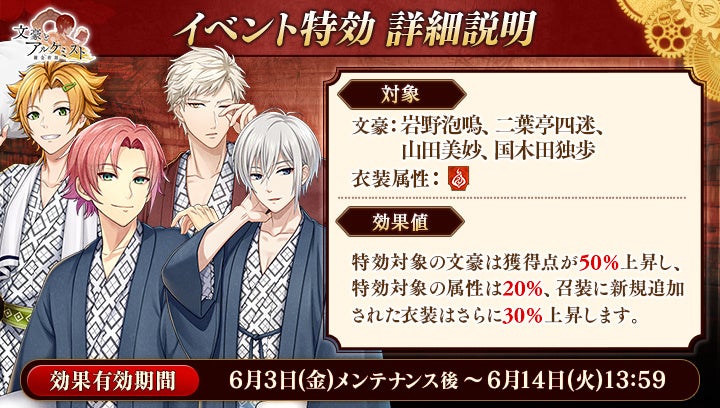 期間中「岩野泡鳴」「二葉亭四迷」「山田美妙」「国木田独歩」の衣装を編成して潜書すると、得点の獲得数がそれぞれ50%上昇します。また、「火」属性の衣装を編成して潜書すると、得点の獲得数がそれぞれ20%上昇します。