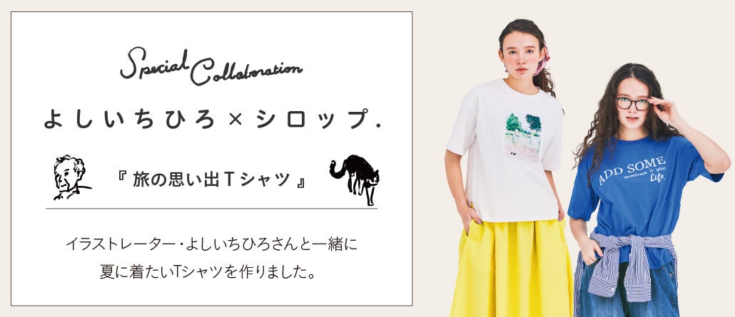 イラストレーター・よしいちひろさんと作った忘れられない夏になるフォトジェニックなTシャツが登場しました。テーマは「summer trip」です。よしいさんがこれまでに旅した、思い出のワンシーンを、描き下ろしのイラストと実際に撮影した写真でエモーショナルに切り取った特別なデザインの組み合わせは、「イラスト×メッセージプリント」「ロゴ×フォトプリント」の2パターンがあります。フロントにもバックスタイルにも、よしいちひろさんの思い出とエッセンスがたっぷりで、着映えも体形カバーもおまかせのボックスシルエットも自慢の、この夏着回したいとっておきの一枚になりそうです。