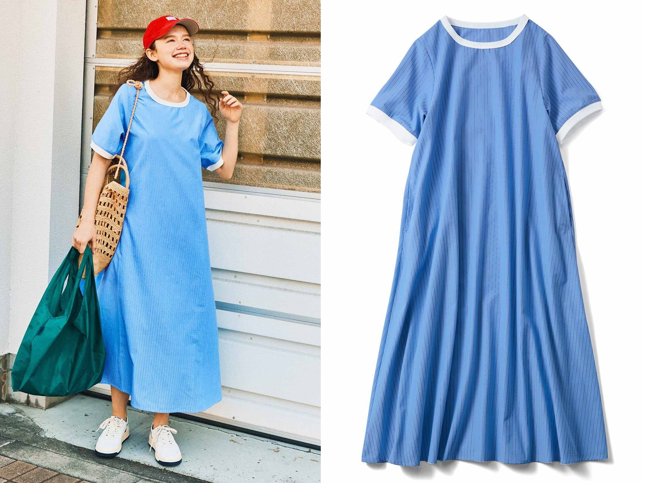 衿ぐりと袖口がリブなので、Tシャツ感覚で着られるストライプ布帛のワンピースです。すぽんとかぶればコーデが完成して便利です。着丈長めのゆったりとしたAラインシルエットで風の抜け感も上々です。