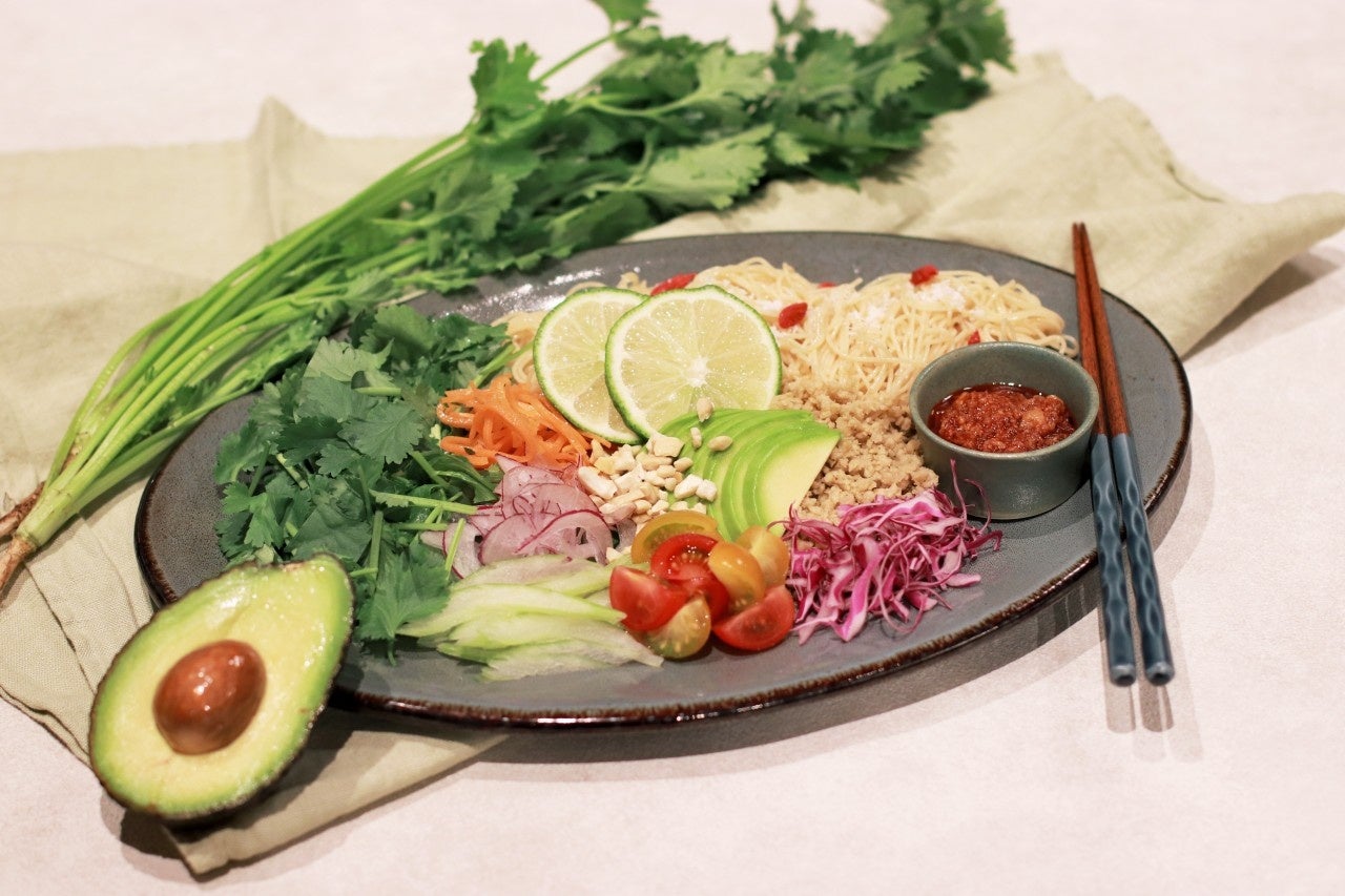 ビタミンC・βカロテン・カルシウムなどを豊富に含むパクチーをたっぷりとのせて、トマトやセロリ、アボカドにライムなど香りや彩りのよい野菜と、ナンプラーのコクをまとわせた大豆ミートのそぼろなどの13品目の食材に、ニンニクオイルで和えた細麺を合わせています。