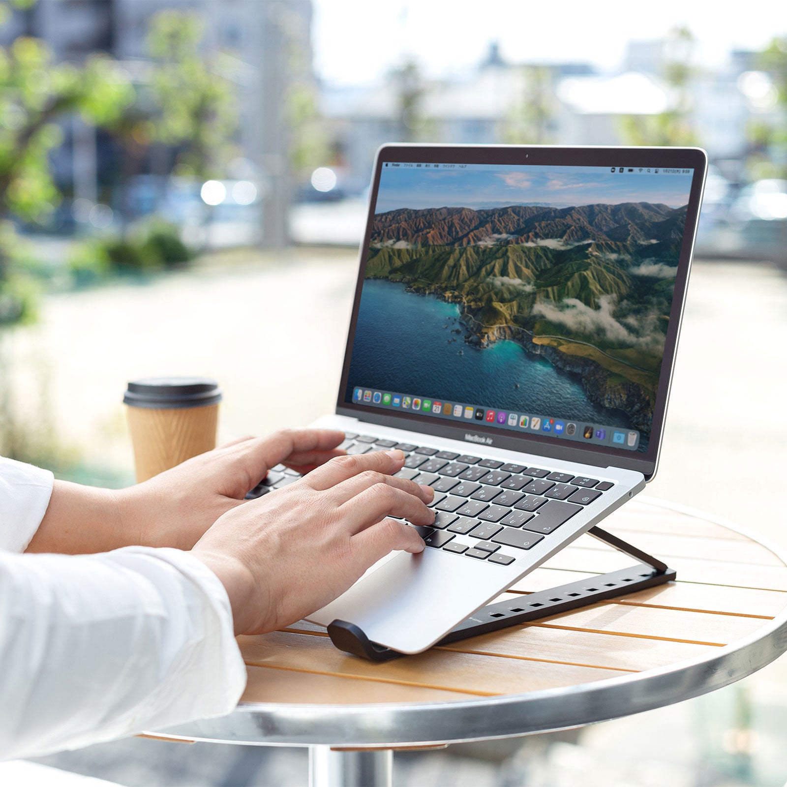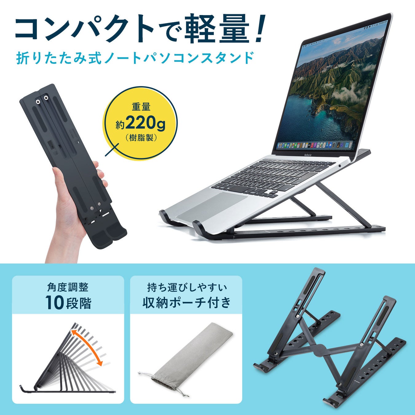 「PDA-STN53BK」は、コンパクトに折りたたみができる、10段階の角度調整機能付きのノートパソコン用スタンドです。