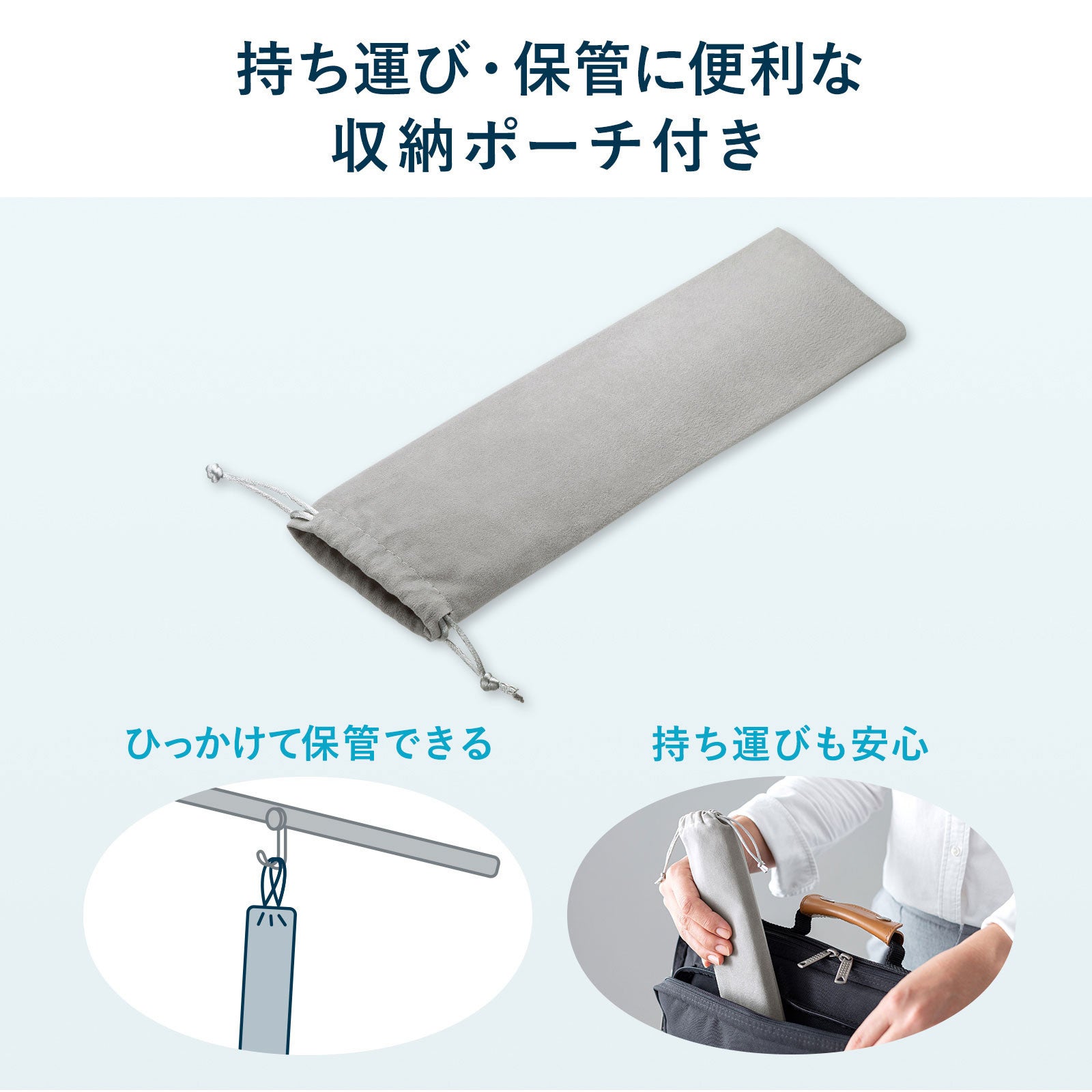 持ち運びに便利な専用収納ポーチが付属しているので、バッグ内の他の収納物へのキズ付きを防ぎます。また、机のフックに引っかけて保管することもできます。