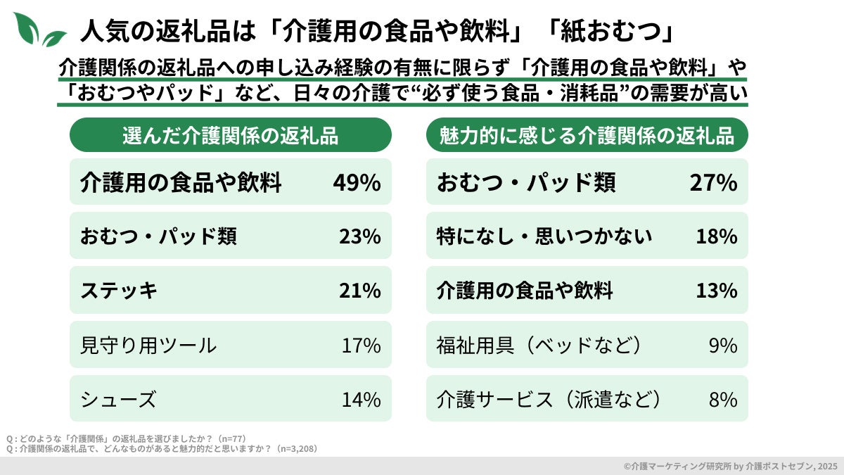 介護関係の返礼品を申し込んだ人(n=77)に「どのような品を選んだか」と、全員(n=3,208)に「どんな返礼品が魅力的か」を尋ねたところ、以下の結果となりました。