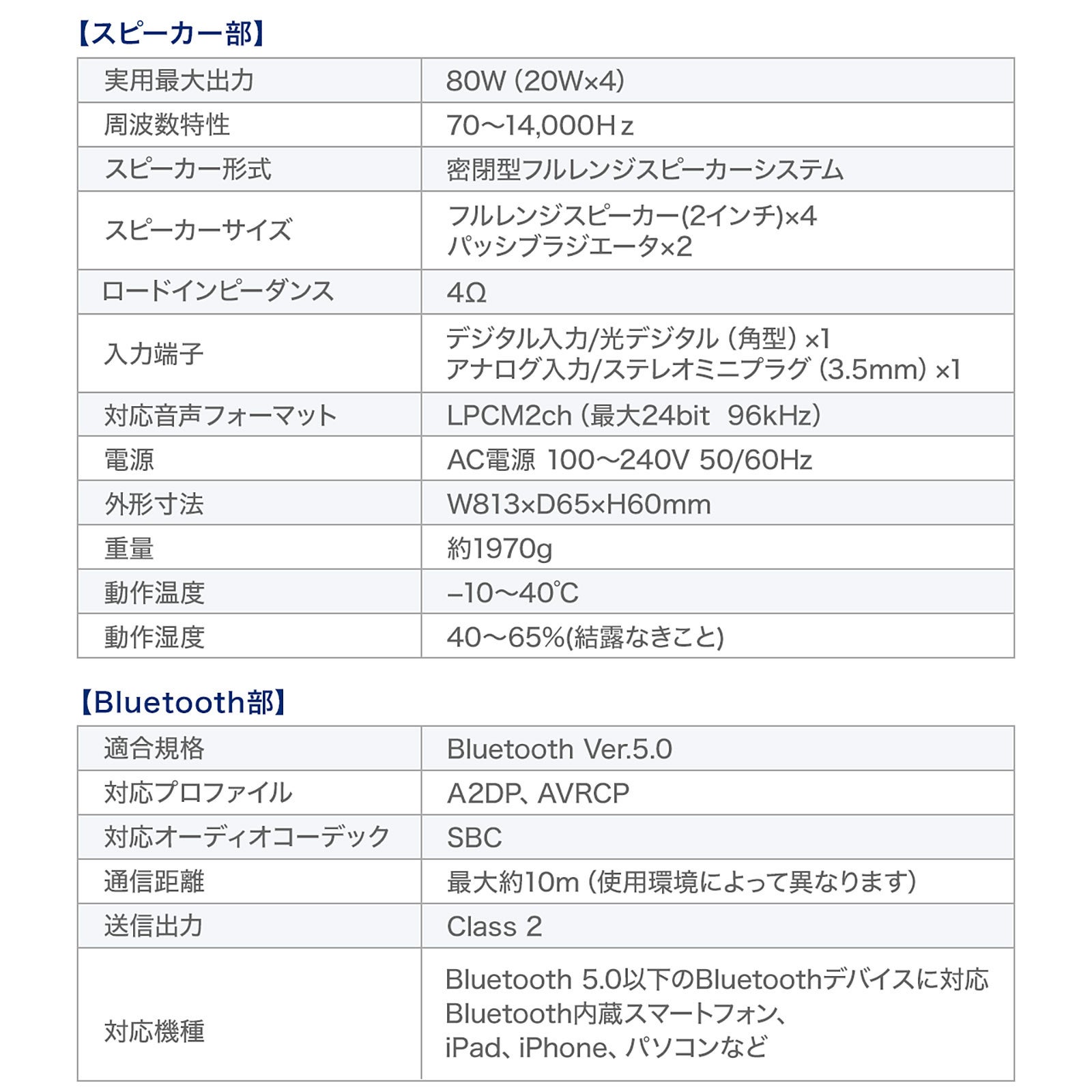 薄型サウンドバー 80W出力 Bluetooth 光デジタル 3.5mm接続対応