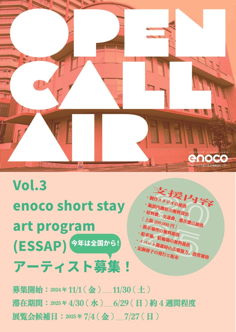 大阪府立江之子島文化芸術創造センターにてVol.3アーティスト・イン・レジデンス enoco short stay art program(ESSAP)の開催決定!今年は、Expo2025大阪・関西万博開催を記念し全国から募集します。