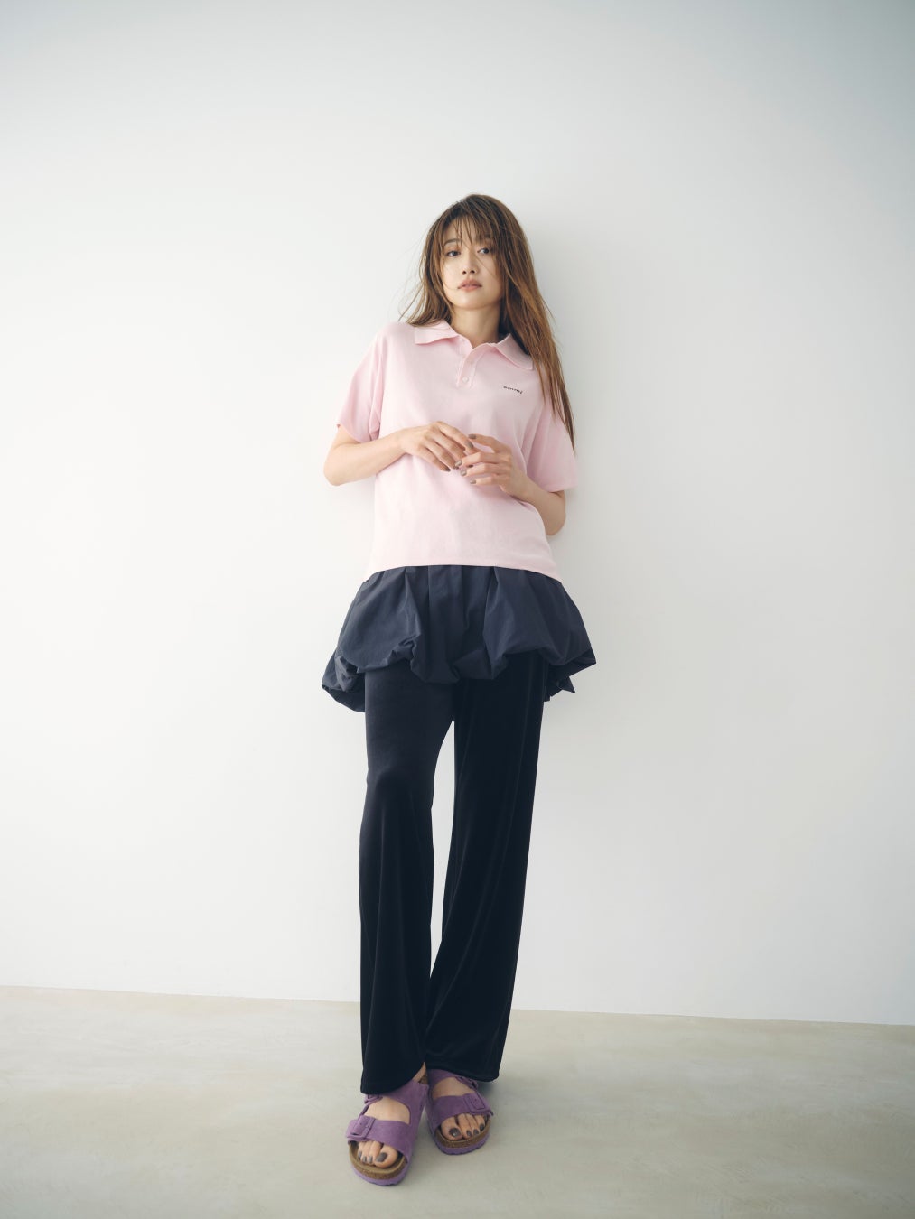 体型を拾わないサイズ感でトラッドなスタイリングを叶えるトレンドのポロニット。